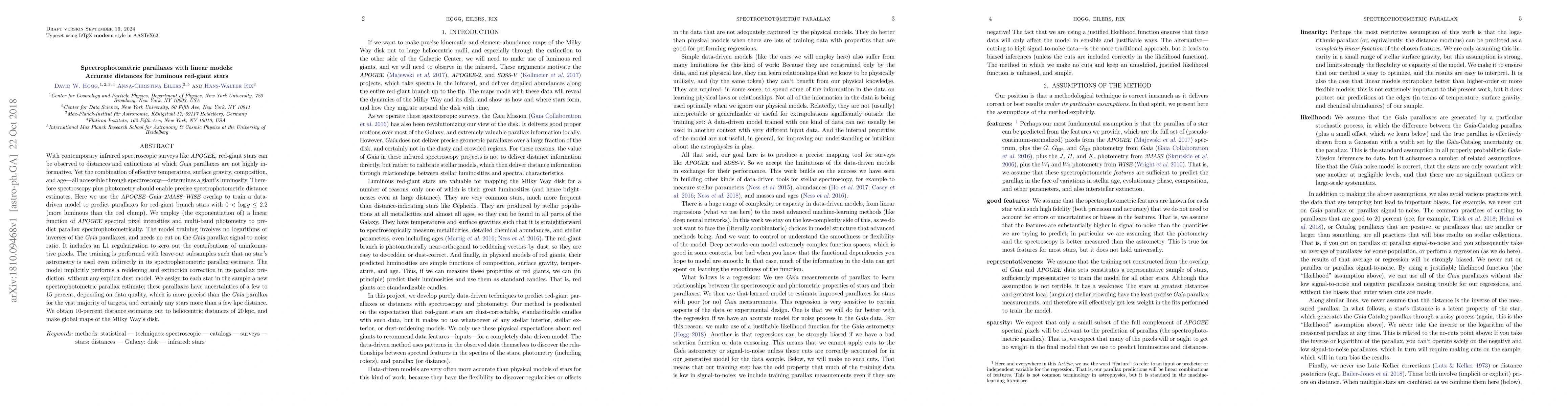 With contemporary infrared spectroscopic surveys like APOGEE, red-giant stars can be observed to distances and extinctions at which Gaia parallaxes are not highly informative. Yet the combination of effective temperature, surface gravity, composition, and age - all accessible through spectroscopy - determines a giant's luminosity. Therefore spectroscopy plus photometry should enable precise spectrophotometric distance estimates. Here we use the APOGEE-Gaia-2MASS-WISE overlap to train a data-driven model to predict parallaxes for red-giant branch stars with $0<\log g\leq2.2$ (more luminous than the red clump). We employ (the exponentiation of) a linear function of APOGEE spectral pixel intensities and multi-band photometry to predict parallax spectrophotometrically. The model training involves no logarithms or inverses of the Gaia parallaxes, and needs no cut on the Gaia parallax signal-to-noise ratio. It includes an L1 regularization to zero out the contributions of uninformative pixels. The training is performed with leave-out subsamples such that no star's astrometry is used even indirectly in its spectrophotometric parallax estimate. The model implicitly performs a reddening and extinction correction in its parallax prediction, without any explicit dust model. We assign to each star in the sample a new spectrophotometric parallax estimate; these parallaxes have uncertainties of a few to 15 percent, depending on data quality, which is more precise than the Gaia parallax for the vast majority of targets, and certainly any stars more than a few kpc distance. We obtain 10-percent distance estimates out to heliocentric distances of $20\,$kpc, and make global maps of the Milky Way's disk.