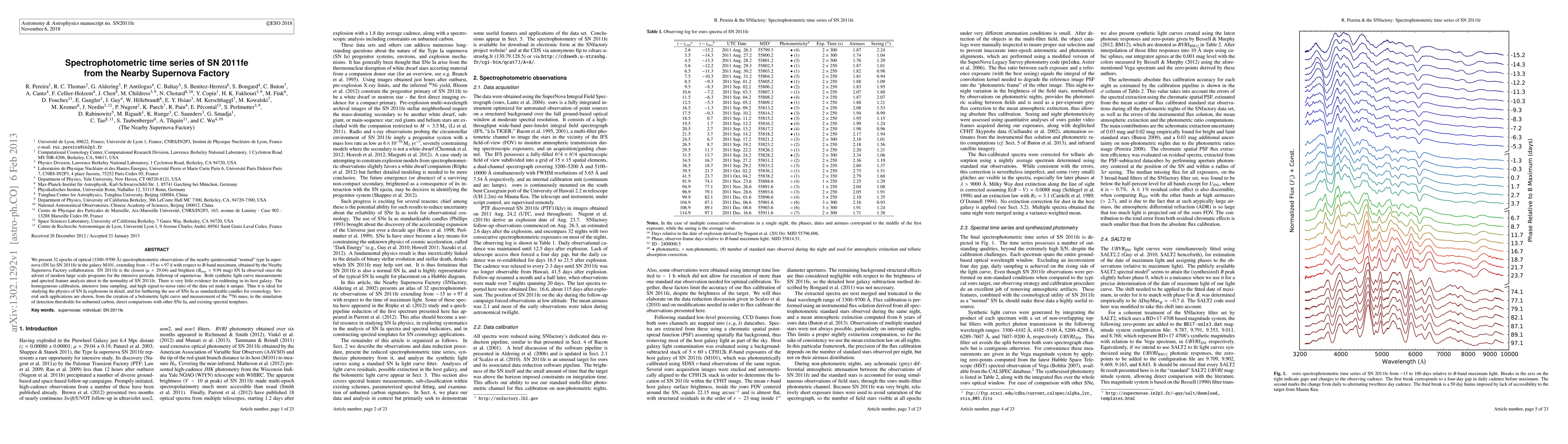 This paper presents 32 epochs of detailed spectrophotometric observations of SN 2011fe, a typical Type Ia supernova, providing insights into its light curve and spectral features. The data, collected by the Nearby Supernova Factory, supports the use of SNe Ia as standard candles for cosmological studies.