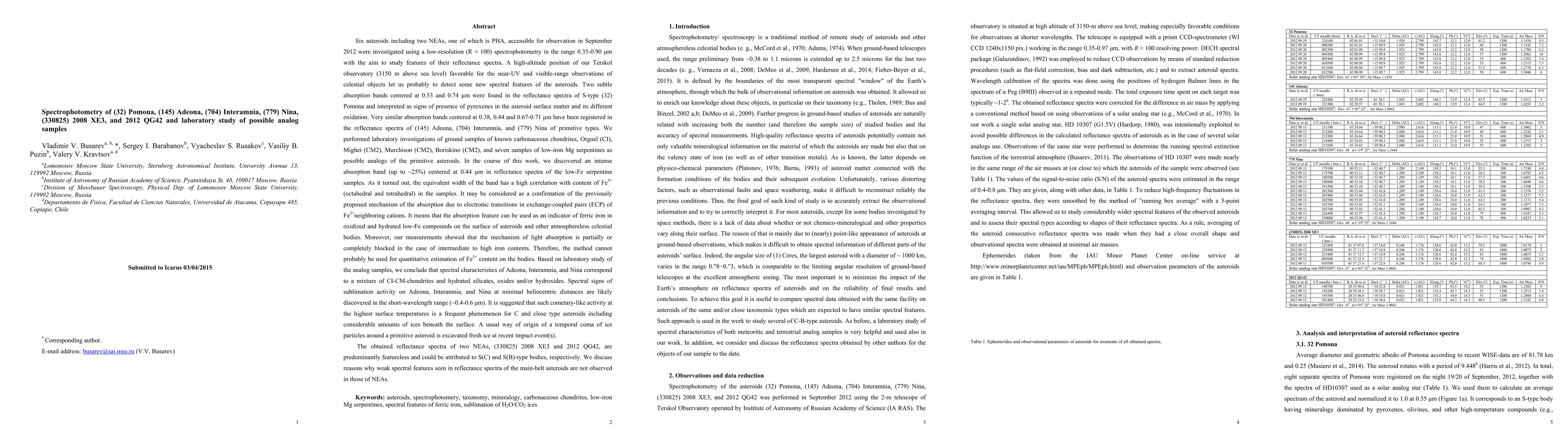 Six asteroids including two NEAs, one of which is PHA, accessible for observation in September 2012 were investigated using a low-resolution spectrophotometry in the range 0.35-0.90 um with the aim to study features of their reflectance spectra. For the first time we discovered likely spectral signs (as a maximum at 0.4-0.6 um in reflectance spectra) of simultaneous sublimation activity and presence of a temporal coma on three primitive-type main-belt asteroids, Adeona, Interamnia, and Nina, being at perihelion distances or approaching to it. We suggest that such a cometary-like activity may be a common phenomenon at the highest subsolar surface temperatures for C and close type asteroids including considerable amounts of H2O and CO2 ices beneath the surface. However, excavation of fresh ice at recent impact event(s) could be an alternative explanation of the phenomenon. Similar absorption bands centered at 0.38, 0.44 and 0.67-0.71 um registered in the reflectance spectra of Adeona, Interamnia, and Nina clearly point to predominantly silicate surface matter. To specify its content, we performed laboratory investigations of ground samples of known carbonaceous chondrites (Orguel, Mighei, Murchison, and Boriskino) and seven samples of low-iron Mg serpentines as possible analogs of the asteroids. In particular, we found that the equivalent width of the band centered at 0.44 um in reflectance spectra of the low-Fe serpentine samples has a high correlation with content of Fe3+ (octahedral and tetrahedral). It means that the absorption feature can be used as an indicator of ferric iron in oxidized and hydrated low-Fe silicate compounds on asteroids (abridged).