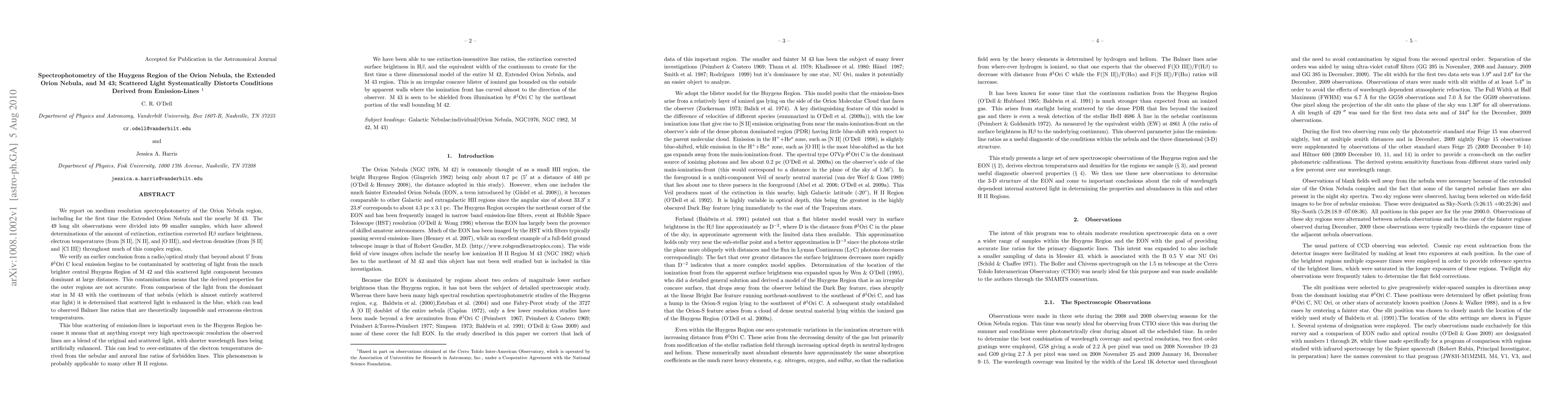 This study uses medium resolution spectrophotometry to analyze the Orion Nebula region, including the Extended Orion Nebula and M~43, revealing that scattered light from the brighter Huygens Region distorts derived properties in outer regions. The blue scattering of emission lines leads to erroneous electron temperatures and impossible Balmer line ratios, affecting even the Huygens Region at lower spectroscopic resolutions.