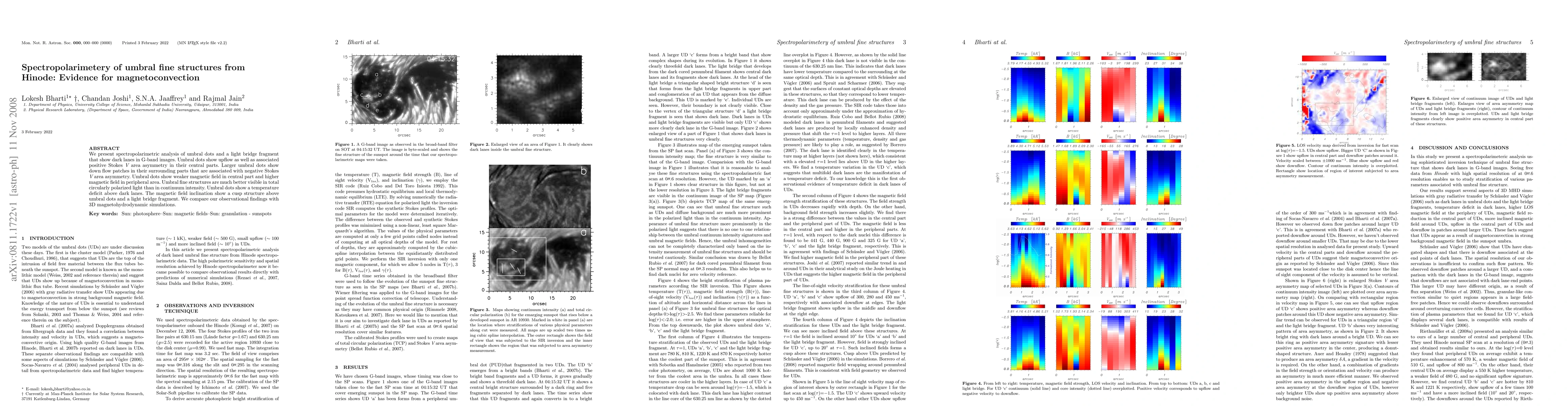 This study uses spectropolarimetry to analyze umbral dots and a light bridge fragment, revealing upflows and magnetic field asymmetries indicative of magnetoconvection. The findings show a temperature deficit above dark lanes and a cusp structure in magnetic field inclination, corroborated by 3D magnetohydrodynamic simulations.