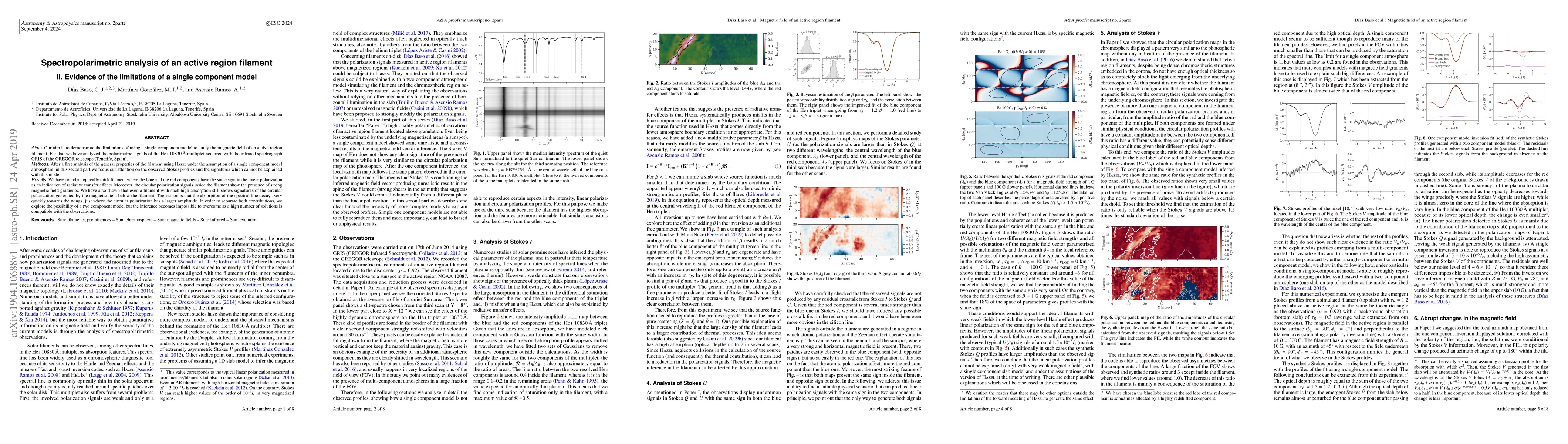 Our aim is to demonstrate the limitations of using a single component model to study the magnetic field of an active region filament. For that we have analyzed the polarimetric signals of the He I 10830 A multiplet acquired with the infrared spectrograph GRIS of the GREGOR telescope (Tenerife, Spain). After a first analysis of the general properties of the filament using Hazel under the assumption of a single component model atmosphere, in this second part we focus our attention on the observed Stokes profiles and the signatures which cannot be explained with this model. We have found an optically thick filament where the blue and the red components have the same sign in the linear polarization as an indication of radiative transfer effects. Moreover, the circular polarization signals inside the filament show the presence of strong magnetic field gradients. We have also shown that even a filament with such high absorption still shows signatures of the circular polarization generated by the magnetic field below the filament. The reason is that the absorption of the spectral line decays very quickly towards the wings, just where the circular polarization has a larger amplitude. In order to separate both contributions, we explore the possibility of a two component model but the inference becomes impossible to overcome as a high number of solutions is compatible with the observations.