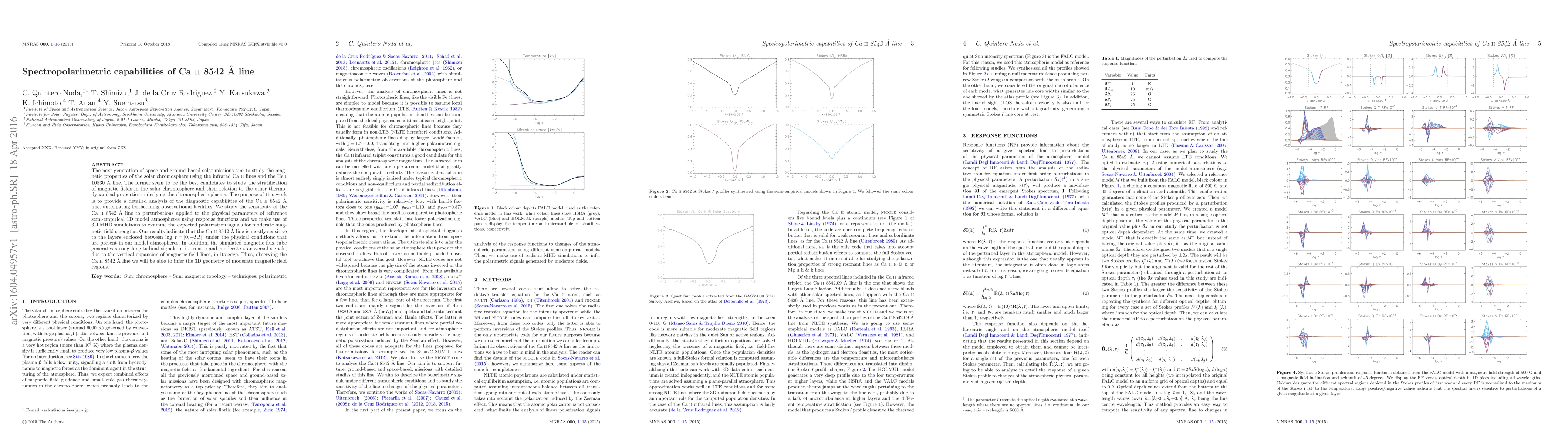 This paper analyzes the diagnostic capabilities of the Ca II 8542 Å line for studying solar chromospheric magnetic fields, finding it sensitive to layers between $\log$ $\tau=[0,-5.5]$. The study reveals that this line can infer the 3D geometry of moderate magnetic fields through strong longitudinal and moderate transversal polarization signals.