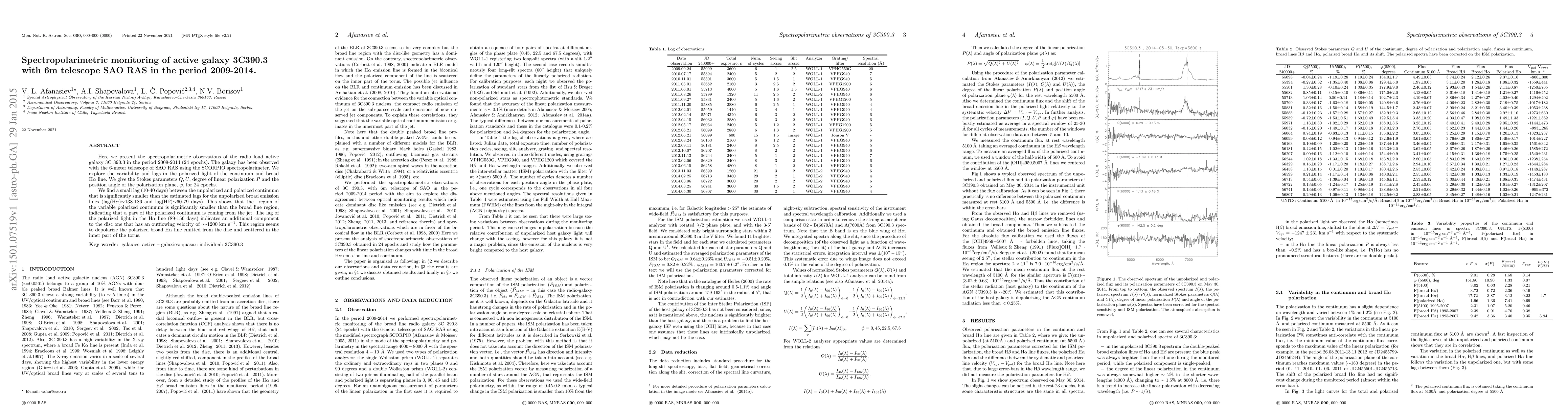 This study uses a 6-meter telescope to monitor the active galaxy 3C390.3 over 5 years, revealing a small lag in polarized light that indicates a jet component with an outflowing velocity of ~1200 km s$^{-1}$.