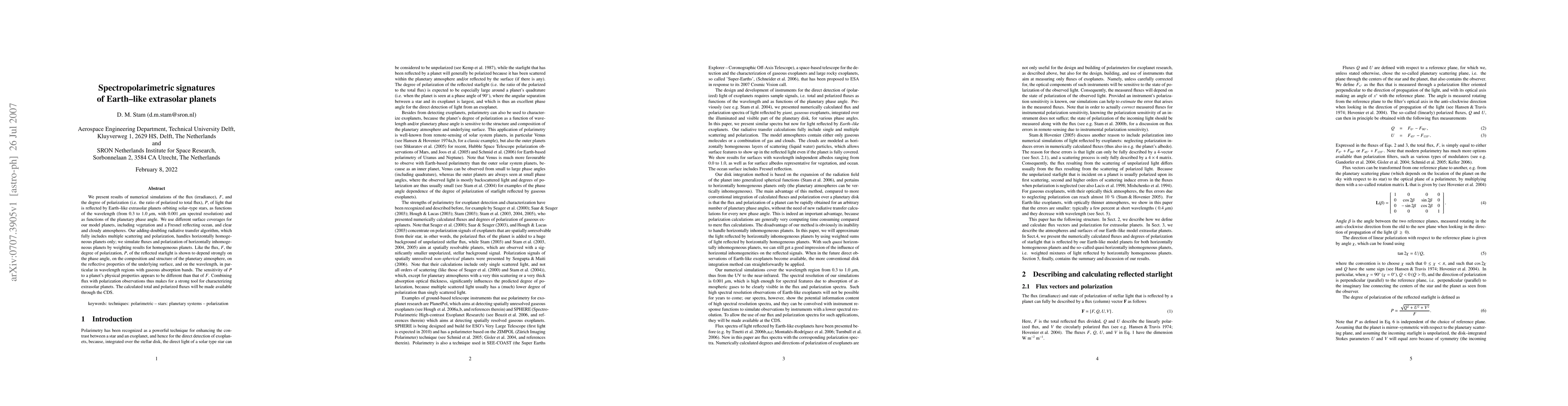This paper presents numerical simulations of the reflected light from Earth-like extrasolar planets, focusing on flux and polarization as functions of wavelength and phase angle. The study highlights the strong dependence of polarization on planetary properties and suggests that combining flux and polarization observations can enhance characterization of these planets.