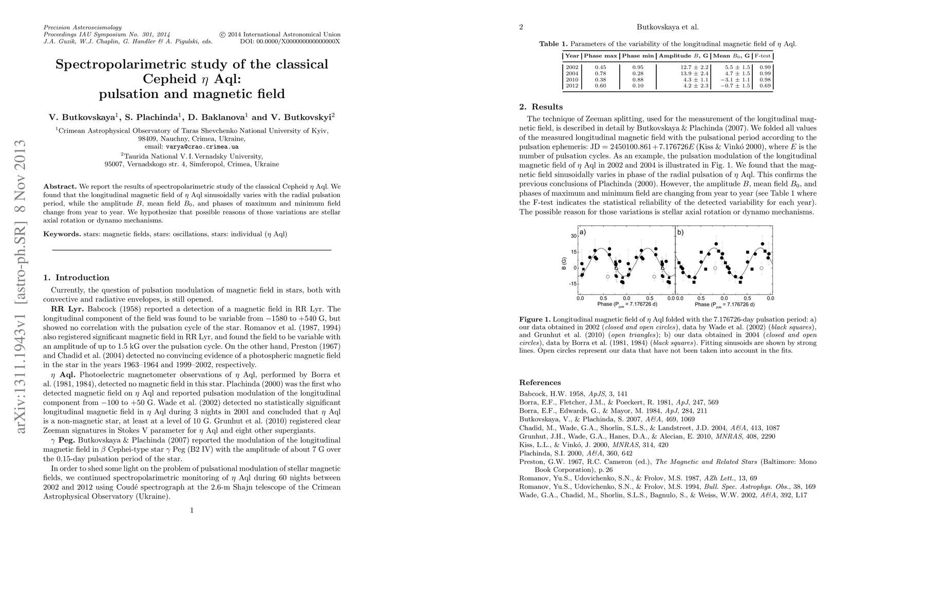 We report the results of spectropolarimetric study of the classical Cepheid $\eta$ Aql. We found that the longitudinal magnetic field of $\eta$ Aql sinusoidally varies with the radial pulsation period, while the amplitude $B$, mean field $B_0$, and phases of maximum and minimum field change from year to year. We hypothesize that possible reasons of those variations are stellar axial rotation or dynamo mechanisms.