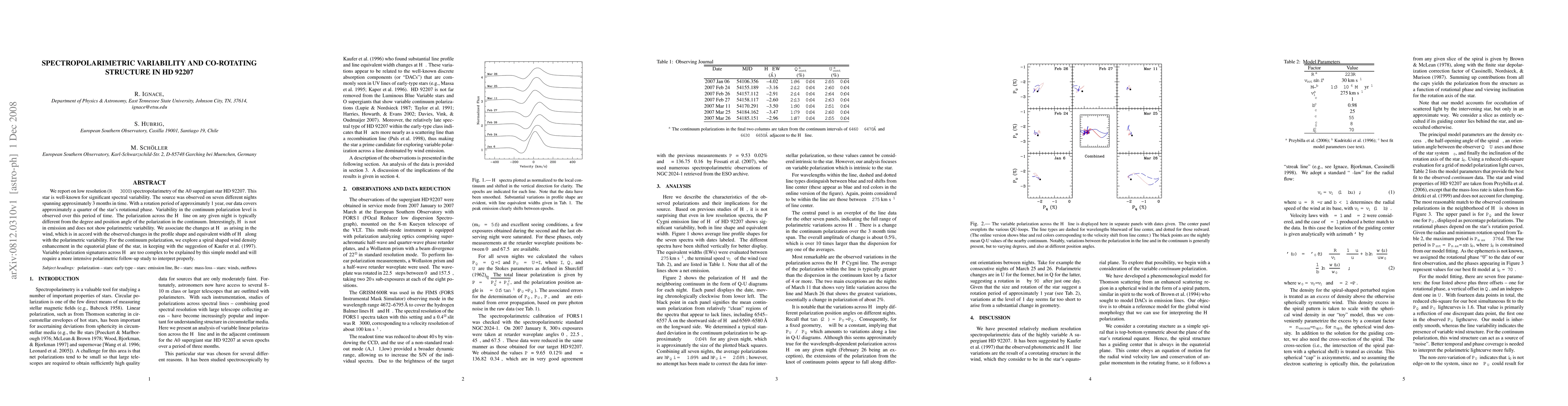 We report on low resolution (R~3000) spectropolarimetry of the A0 supergiant star HD 92207. This star is well-known for significant spectral variability. The source was observed on seven different nights spanning approximately 3 months in time. With a rotation period of approximately 1 year, our data covers approximately a quarter of the star's rotational phase. Variability in the continuum polarization level is observed over this period of time. The polarization across the Halpha line on any given night is typically different from the degree and position angle of the polarization in the continuum. Interestingly, Hbeta is not in emission and does not show polarimetric variability. We associate the changes at Halpha as arising in the wind, which is in accord with the observed changes in the profile shape and equivalent width of Halpha along with the polarimetric variability. For the continuum polarization, we explore a spiral shaped wind density enhancement in the equatorial plane of the star, in keeping with the suggestion of Kaufer etal (1997). Variable polarization signatures across Halpha are too complex to be explained by this simple model and will require a more intensive polarimetric follow-up study to interpret properly.