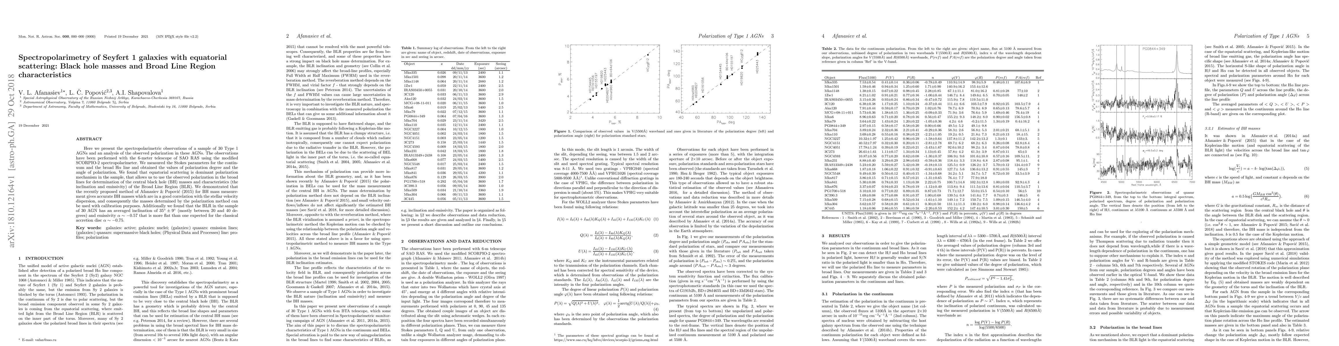 Here we present the spectropolarimetric observations of a sample of 30 Type 1 AGNs and an analysis of the observed polarization in these AGNs. The observations have been performed with the 6-meter telescope of SAO RAS using the modified SCORPIO-2 spectropolarimeter. We measured the Stokes parameters for the continuum and the broad H$\alpha$ line and obtained the values of polarization degree and the angle of polarization. We found that equatorial scattering is dominant polarization mechanism in the sample, that allows us to use the observed polarization in the broad lines for determination of the central black hole (BH) masses and characteristics (the inclination and emissivity) of the Broad Line Region (BLR). We demonstrated that the recently proposed method of \cite{ap15} for BH mass measurement gives accurate BH masses which are in a good correlation with the stellar velocity dispersion, and consequently the masses determined by the polarization method can be used with calibration purposes. Additionally we found that the BLR in the sample of 30 AGN has an averaged inclination of $35^\circ\pm9^\circ$ (mostly between 20 and 40 degrees) and emissivity $\alpha\sim -0.57$ that is more flat than one expected for the classical accretion disc $\alpha\sim -0.75$.