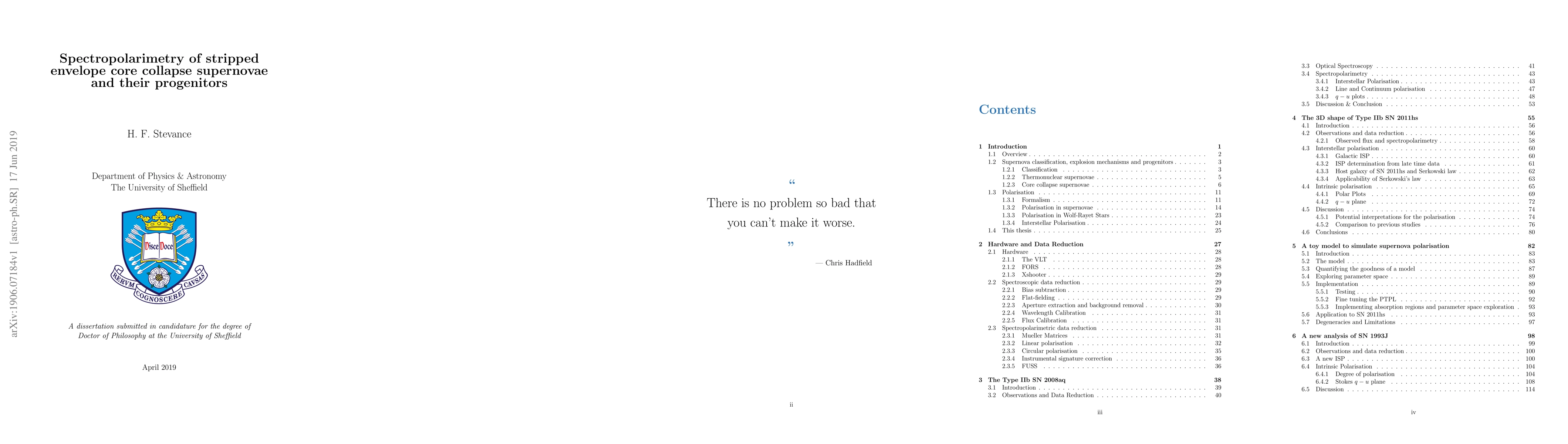 Over the past 30 years, spectropolarimetry has proven to be a great tool to probe the 3D geometry of core collapse supernovae (CCSNe). The number of high-quality multi-epoch spectropolarimetric data sets for CCSNe remains quite low, however, due to the challenging nature of such observations. In this Thesis we present and analyse the data of two Type IIb SNe (SN 2008aq - two epochs, SN 2011hs - seven epochs) and one Type Ic-bl (SN 2014ad - seven epochs). The latter is the most complete spectropolarimetric data set for a Type Ic-bl to date. We also provide a preliminary re-analysis of the spectropolarimetric data of SN 1993J. The new datasets demonstrate that the spectropolarimetry of stripped envelope supernovae is complex and varied, and although early studies of type IIb SNe showed similar behaviour to type IIP, it is now clear that this early trend is broken by a growing sample of SNe. Additionally, we identified potential signatures of a jet in SN 2014ad. Furthermore, a toy model to simulate spectropolarimetry from simple geometries (similar to Reilly et al. 2016) was created. A systematic approach to parameter space exploration was developped; this showed that unfortunately these models suffer extreme degeneracies and may not lead to accurate interpretations. Finally, spectropolarimetry can also be used to probe asymmetries caused by fast rotation in the potential progenitors of stripped envelope CCSNe. Although numerous Wolf-Rayet stars of type WN and WC have been observed with spectropolarimetry, no single WO stars have been studied to date. In our data of two Galactic WO stars, we found no line effect and could not sufficiently constrain the rotational velocity to exclude a collapsar scenario. Therefore, the absence of a line effect may not necessarily equate to a low rotational velocity.