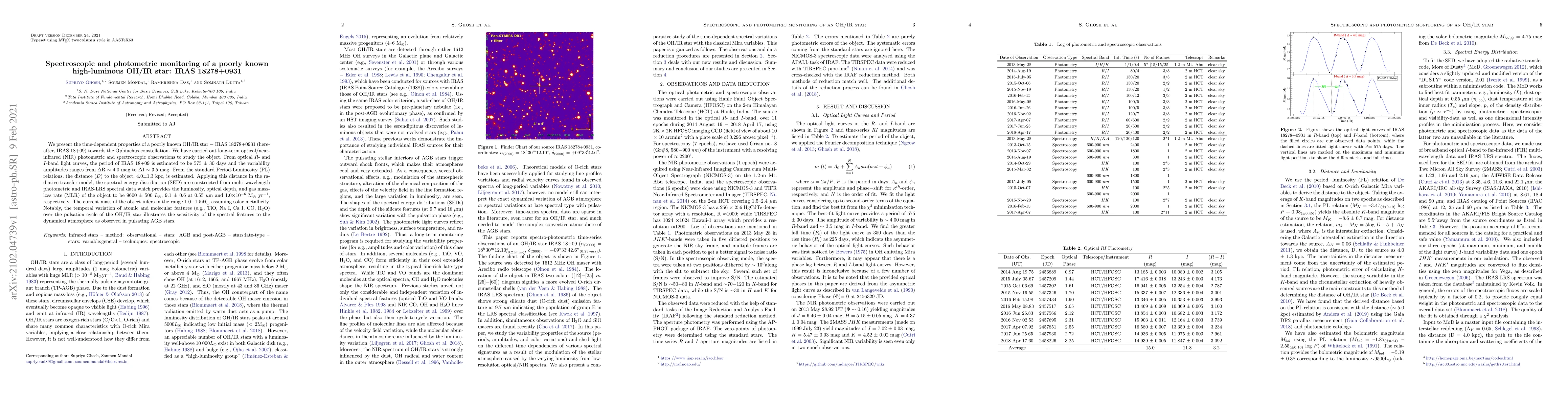 We present the time-dependent properties of a poorly known OH/IR star $-$ IRAS 18278+0931 (hereafter, IRAS 18+09) towards the Ophiuchus constellation. We have carried out long-term optical/near-infrared (NIR) photometric and spectroscopic observations to study the object. From optical $R$- and $I$-band light curves, the period of IRAS 18+09 is estimated to be 575 $\pm$ 30 days and the variability amplitudes range from $\Delta$R $\sim$ 4.0 mag to $\Delta$I $\sim$ 3.5 mag. From the standard Period-Luminosity (PL) relations, the distance ($D$) to the object, 4.0 $\pm$ 1.3 kpc, is estimated. Applying this distance in the radiative transfer model, the spectral energy distribution (SED) are constructed from multi-wavelength photometric and IRAS-LRS spectral data which provides the luminosity, optical depth, and gas mass-loss rate (MLR) of the object to be 9600 $\pm$ 500 $L_{\odot}$, 9.1 $\pm$ 0.6 at 0.55 $\mu$m and 1.0$\times$10$^{-6}$ M$_\odot$ yr$^{-1}$, respectively. The current mass of the object infers in the range 1.0 $-$ 1.5 $M_\odot$ assuming solar metallicity. Notably, the temporal variation of atomic and molecular features (e.g., TiO, Na I, Ca I, CO, H$_2$O) over the pulsation cycle of the OH/IR star illustrates the sensitivity of the spectral features to the dynamical atmosphere as observed in pulsating AGB stars.