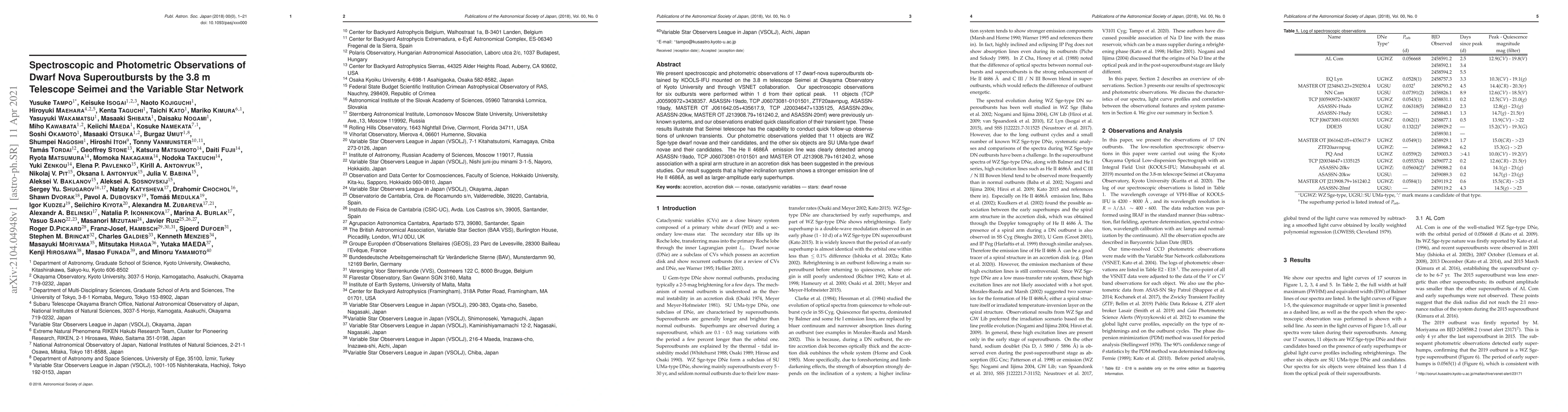 This study presents spectroscopic and photometric observations of 17 dwarf-nova superoutbursts using the 3.8 m Seimei telescope and VSNET collaboration. The findings classify 11 previously unknown systems and suggest that higher-inclination systems exhibit stronger He II 4686Å emission lines.