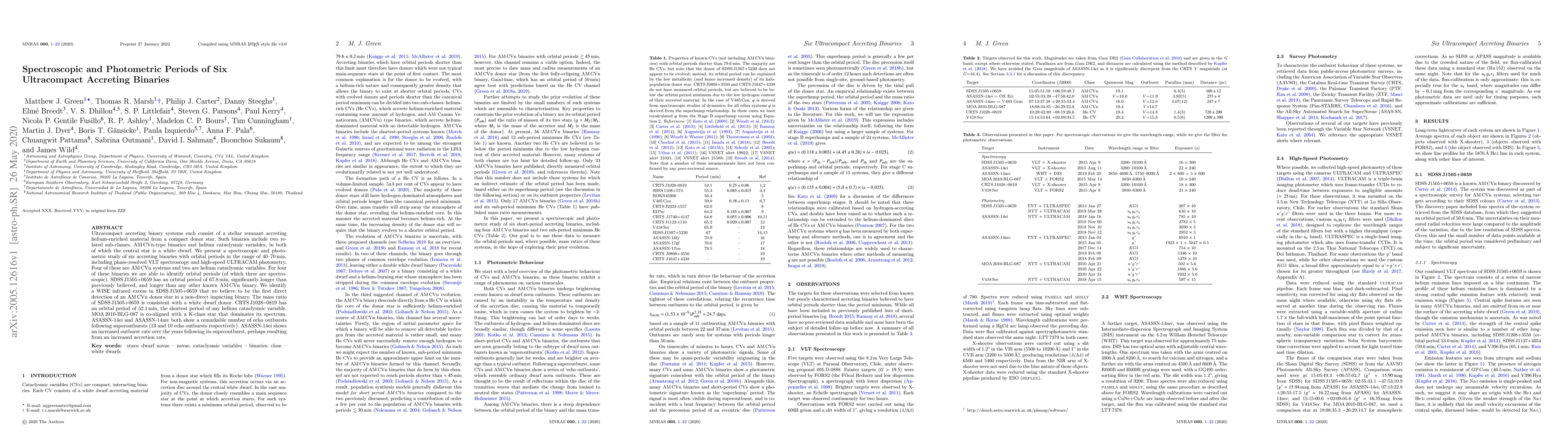 This study presents spectroscopic and photometric analysis of six ultracompact accreting binaries, identifying orbital periods ranging from 40 to 70 minutes, with SDSS J1505+0659 having the longest period at 67.8 min, and CRTS J1028-0819 the shortest at 52.1 min.