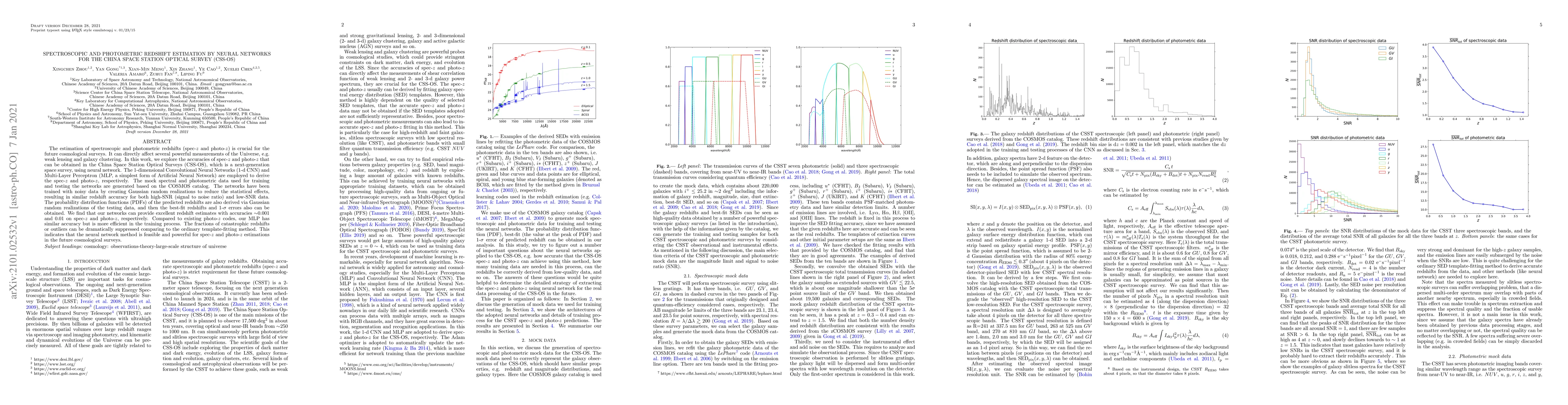 The estimation of spectroscopic and photometric redshifts (spec-z and photo-z) is crucial for future cosmological surveys. It can directly affect several powerful measurements of the Universe, e.g. weak lensing and galaxy clustering. In this work, we explore the accuracies of spec-z and photo-z that can be obtained in the China Space Station Optical Surveys (CSS-OS), which is a next-generation space survey, using neural networks. The 1-dimensional Convolutional Neural Networks (1-d CNN) and Multi-Layer Perceptron (MLP, one of the simplest forms of Artificial Neural Network) are employed to derive the spec-z and photo-z, respectively. The mock spectral and photometric data used for training and testing the networks are generated based on the COSMOS catalog. The networks have been trained with noisy data by creating Gaussian random realizations to reduce the statistical effects, resulting in similar redshift accuracy for both high-SNR (signal to noise ratio) and low-SNR data. The probability distribution functions (PDFs) of the predicted redshifts are also derived via Gaussian random realizations of the testing data, and then the best-fit redshifts and 1-sigma errors also can be obtained. We find that our networks can provide excellent redshift estimates with accuracies ~0.001 and 0.01 on spec-z and photo-z, respectively. Compared to existing photo-z codes, our MLP has similar accuracy but is more efficient in the training process. The fractions of catastrophic redshifts or outliers can be dramatically suppressed comparing to the ordinary template-fitting method. This indicates that the neural network method is feasible and powerful for spec-z and photo-z estimations in future cosmological surveys.