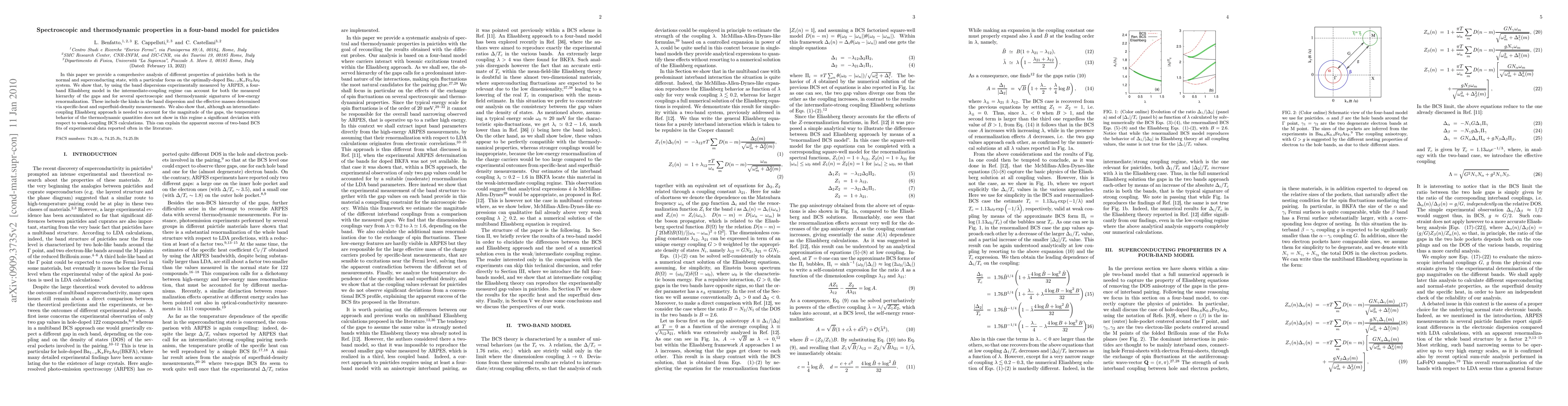 In this paper we provide a comprehesive analysis of different properties of pnictides both in the normal and superconducting state, with a particular focus on the optimally-doped Ba$_{1-x}$K$_{x}$Fe$_2$As$_2$ system. We show that, by using the band dispersions experimentally measured by ARPES, a four-band Eliashberg model in the intermediate-coupling regime can account for both the measured hierarchy of the gaps and for several spectroscopic and thermodynamic signatures of low-energy renormalization. These include the kinks in the band dispersion and the effective masses determined via specific-heat and superfluid-density measurements. We also show that, although an intermediate-coupling Eliashberg approach is needed to account for the magnitude of the gaps, the temperature behavior of the thermodynamic quantities does not show in this regime a significant deviation with respect to weak-coupling BCS calculations. This can explain the apparent success of two-band BCS fits of experimental data reported often in the literature.