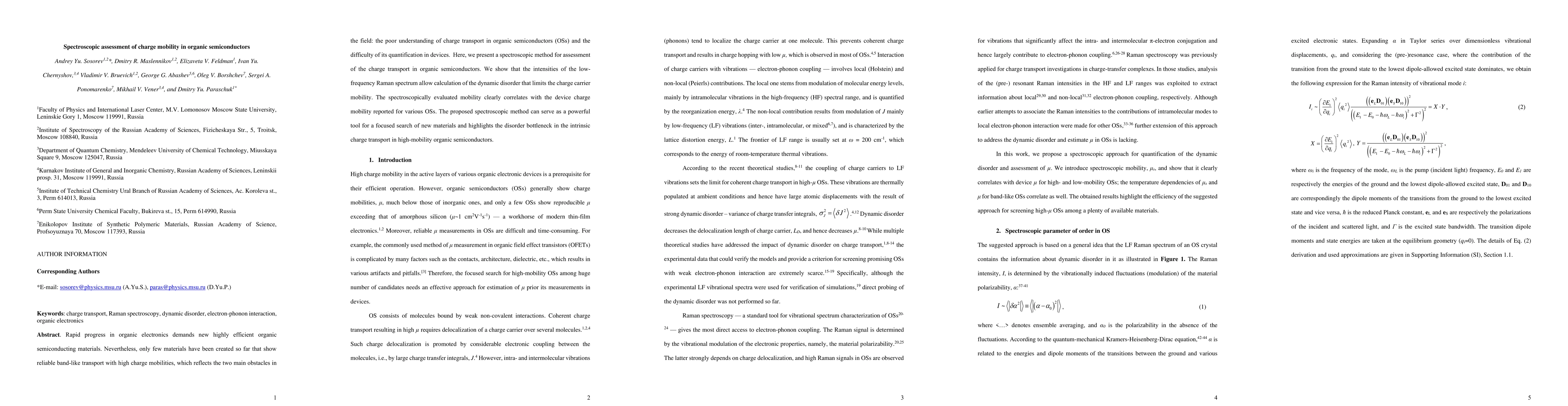 This research introduces a spectroscopic method for evaluating charge transport in organic semiconductors, demonstrating that low-frequency Raman spectrum intensities can quantify dynamic disorder and correlate with device charge mobility, offering a new tool for material discovery and addressing intrinsic transport limitations.