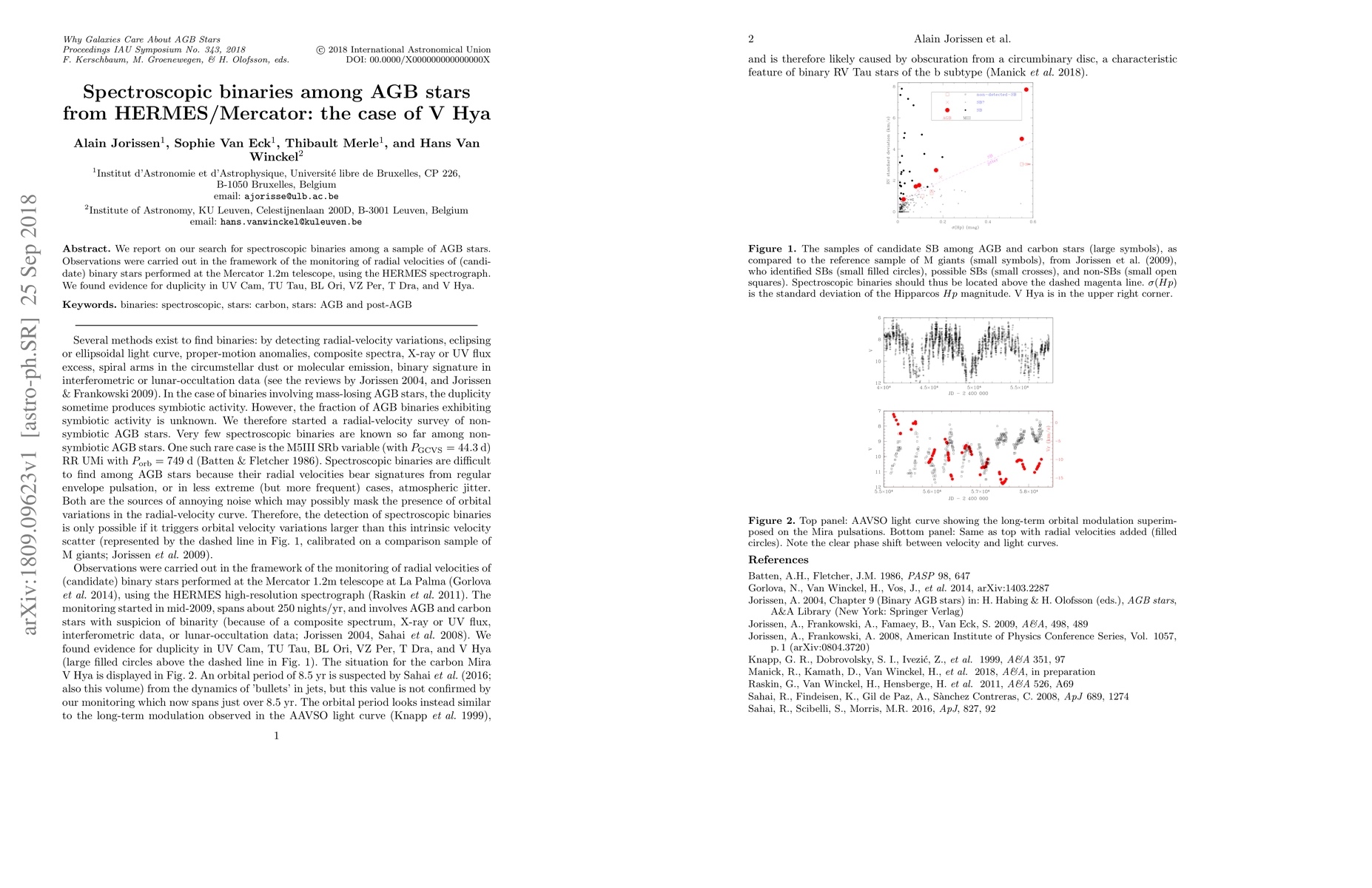 This study identifies spectroscopic binaries among AGB stars using HERMES/Mercator observations, finding evidence of duplicity in several stars, including V Hya, which exhibits RV Tau b-type binary behavior characterized by a surrounding disc.
