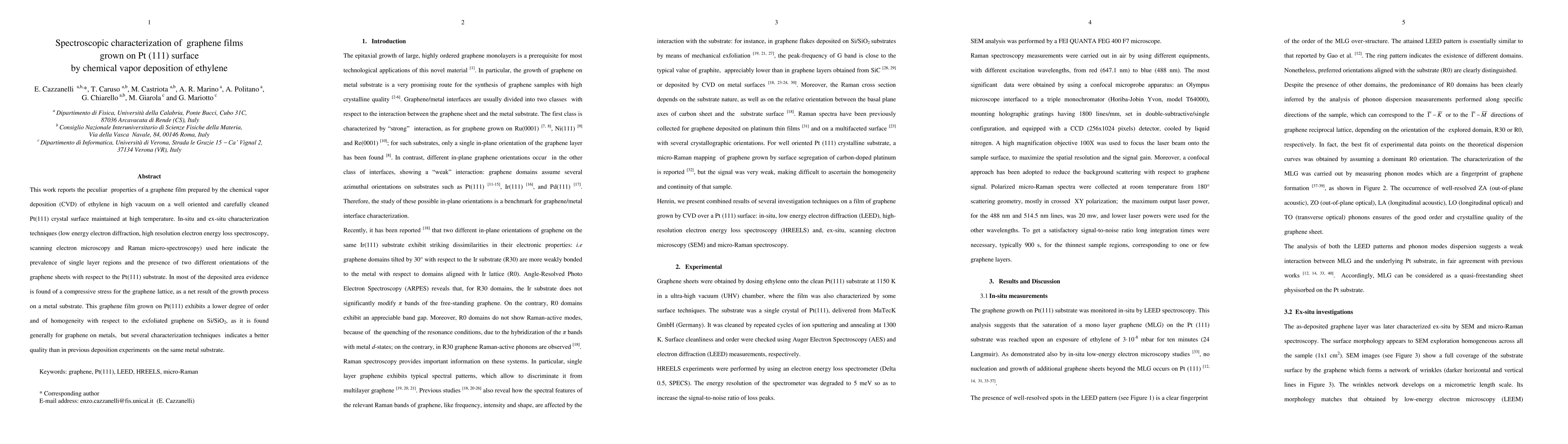 This study characterizes graphene films grown on Pt(111) via ethylene CVD, revealing single-layer regions and two graphene orientations, with most areas showing compressive stress. Compared to exfoliated graphene, this film exhibits lower order and homogeneity but better quality than previous metal substrate depositions.