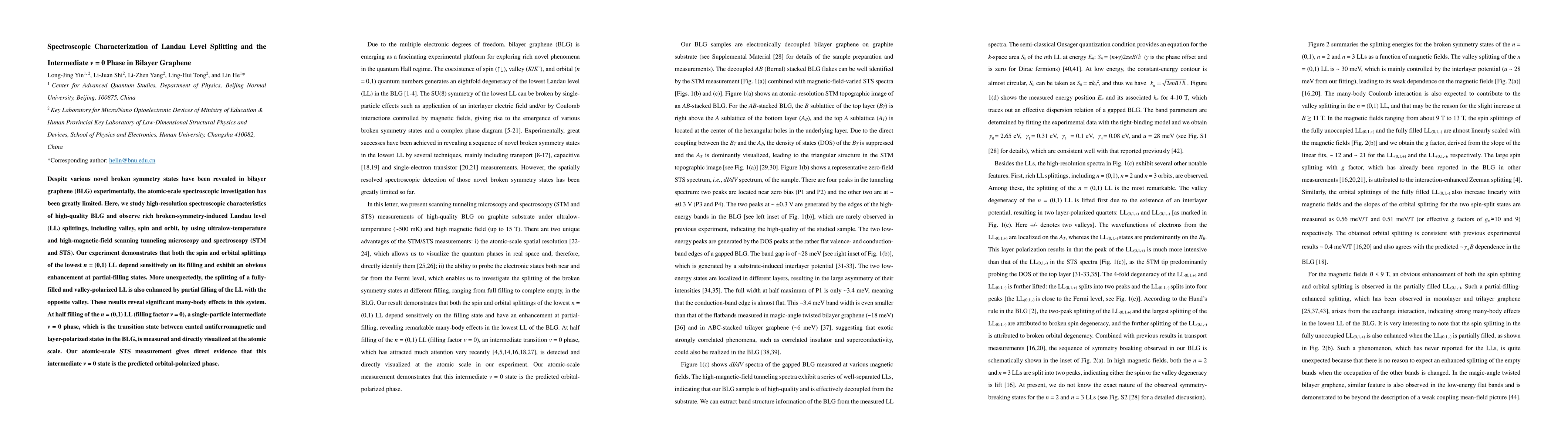 This paper reports high-resolution spectroscopic characterization of Landau level splitting in bilayer graphene using ultralow-temperature and high-magnetic-field scanning tunneling microscopy and spectroscopy. The study reveals significant many-body effects and directly visualizes an intermediate v = 0 phase at the atomic scale, confirming it as an orbital-polarized state.
