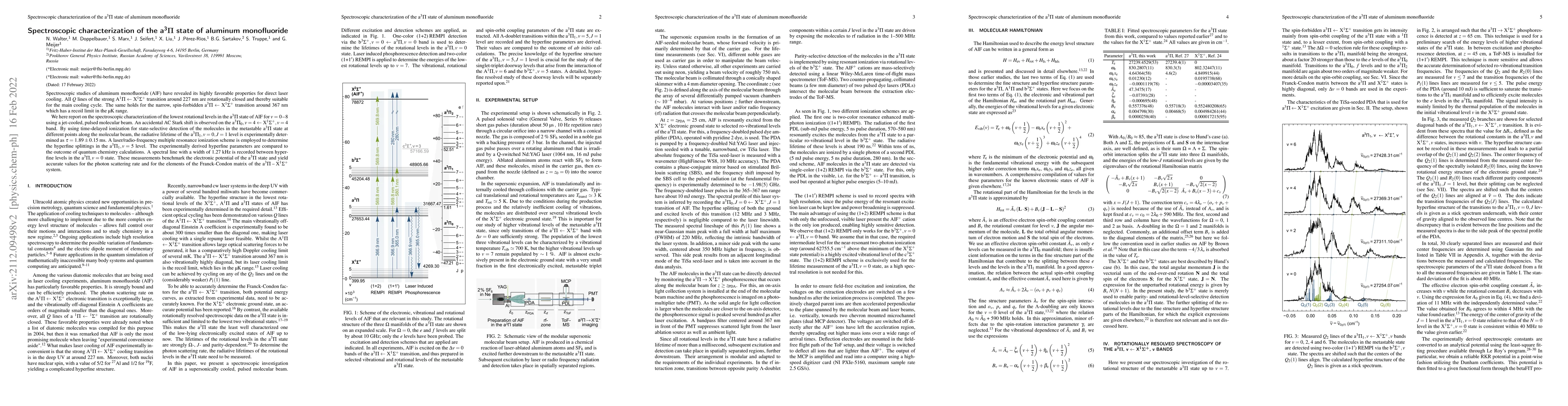 Spectroscopic studies of aluminum monofluoride (AlF) have revealed its highly favorable properties for direct laser cooling. All $Q$ lines of the strong A$^1\Pi$ $\leftarrow$ X$^1\Sigma^+$ transition around 227~nm are rotationally closed and thereby suitable for the main cooling cycle. The same holds for the narrow, spin-forbidden a$^3\Pi$ $\leftarrow$ X$^1\Sigma^+$ transition around 367 nm which has a recoil limit in the micro Kelvin range. We here report on the spectroscopic characterization of the lowest rotational levels in the a$^3\Pi$ state of AlF for $v=0-8$ using a jet-cooled, pulsed molecular beam. An accidental AC Stark shift is observed on the a$^3\Pi_0, v=4$ $\leftarrow$ X$^1\Sigma^+, v=4$ band. By using time-delayed ionization for state-selective detection of the molecules in the metastable a$^3\Pi$ state at different points along the molecular beam, the radiative lifetime of the a$^3\Pi_1, v=0, J=1$ level is experimentally determined as $\tau=1.89 \pm 0.15$~ms. A laser/radio-frequency multiple resonance ionization scheme is employed to determine the hyperfine splittings in the a$^3\Pi_1, v=5$ level. The experimentally derived hyperfine parameters are compared to the outcome of quantum chemistry calculations. A spectral line with a width of 1.27 kHz is recorded between hyperfine levels in the a$^3\Pi, v=0$ state. These measurements benchmark the electronic potential of the a$^3\Pi$ state and yield accurate values for the photon scattering rate and for the elements of the Franck-Condon matrix of the a$^3\Pi$ $-$ X$^1\Sigma^+$ system.