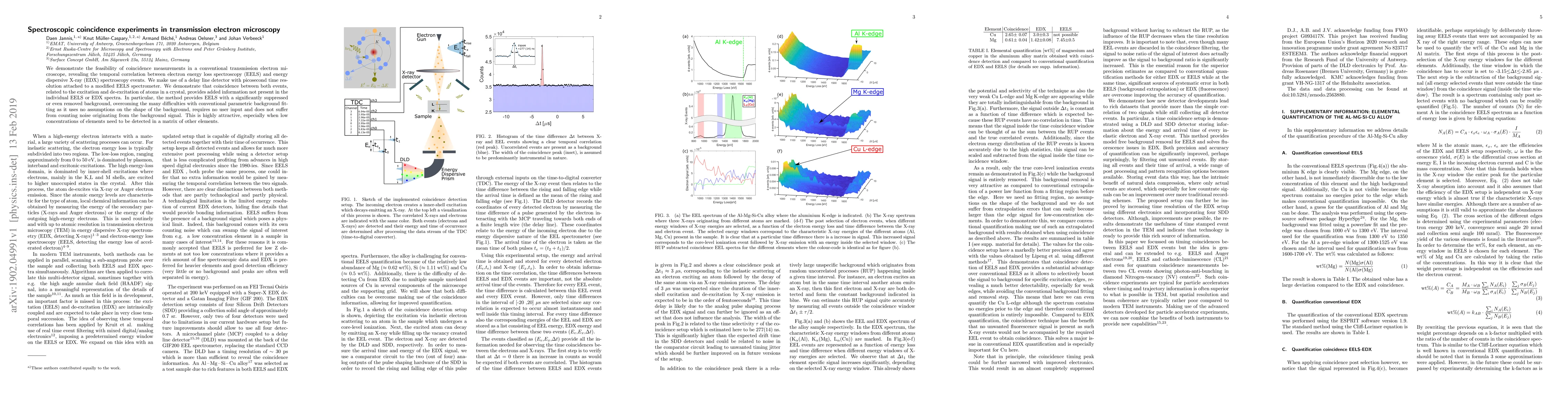 We demonstrate the feasibility of coincidence measurements in a conventional transmission electron microscope, revealing the temporal correlation between electron energy loss spectroscopy (EELS) and energy dispersive X-ray (EDX) spectroscopy events. We make use of a delay line detector with picosecond time resolution attached to a modified EELS spectrometer. We demonstrate that coincidence between both events, related to the excitation and de-excitation of atoms in a crystal, provides added information not present in the individual EELS or EDX spectra. In particular, the method provides EELS with a significantly suppressed or even removed background, overcoming the many difficulties with conventional parametric background fitting as it uses no assumptions on the shape of the background, requires no user input and does not suffer from counting noise originating from the background signal. This is highly attractive, especially when low concentrations of elements need to be detected in a matrix of other elements.