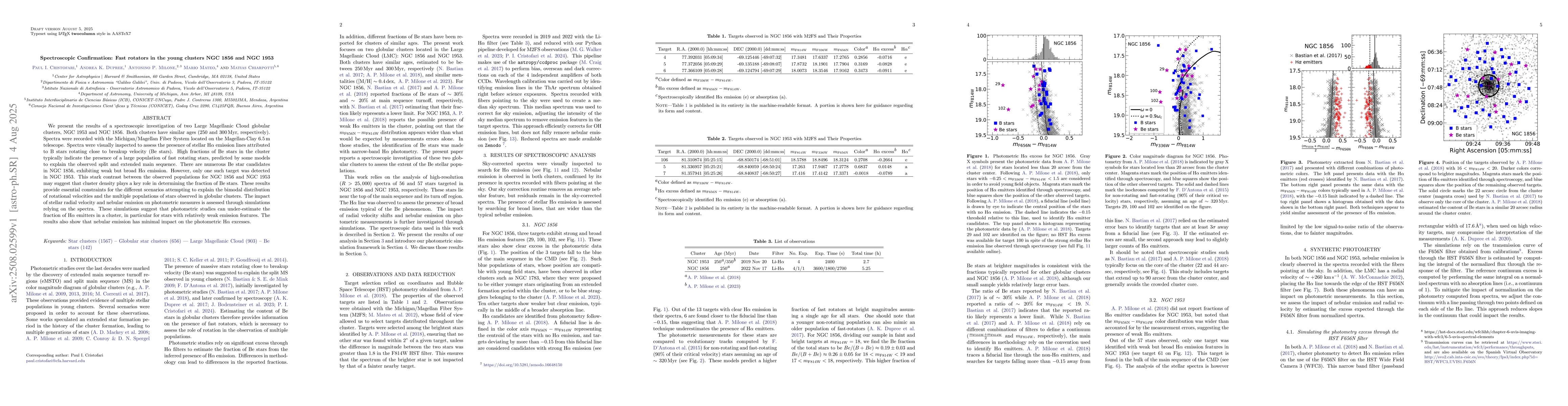 We present the results of a spectroscopic investigation of two Large Magellanic Cloud globular clusters, NGC 1953 and NGC 1856. Both clusters have similar ages (250 and 300 Myr, respectively). Spectra were recorded with the Michigan/Magellan Fiber System located on the Magellan-Clay 6.5m telescope. Spectra were visually inspected to assess the presence of stellar H$\alpha$ emission lines attributed to B stars rotating close to breakup velocity (Be stars). High fractions of Be stars in the cluster typically indicate the presence of a large population of fast rotating stars, predicted by some models to explain the observed split and extended main sequence. There are numerous Be star candidates in NGC 1856, exhibiting weak but broad H$\alpha$ emission. However, only one such target was detected in NGC 1953. This stark contrast between the observed populations for NGC 1856 and NGC 1953 may suggest that cluster density plays a key role in determining the fraction of Be stars. These results provide essential constraints for the different scenarios attempting to explain the bimodal distribution of rotational velocities and the multiple populations of stars observed in globular clusters. The impact of stellar radial velocity and nebular emission on photometric measures is assessed through simulations relying on the spectra. These simulations suggest that photometric studies can under-estimate the fraction of H$\alpha$ emitters in a cluster, in particular for stars with relatively weak emission features. The results also show that nebular emission has minimal impact on the photometric H$\alpha$ excesses.