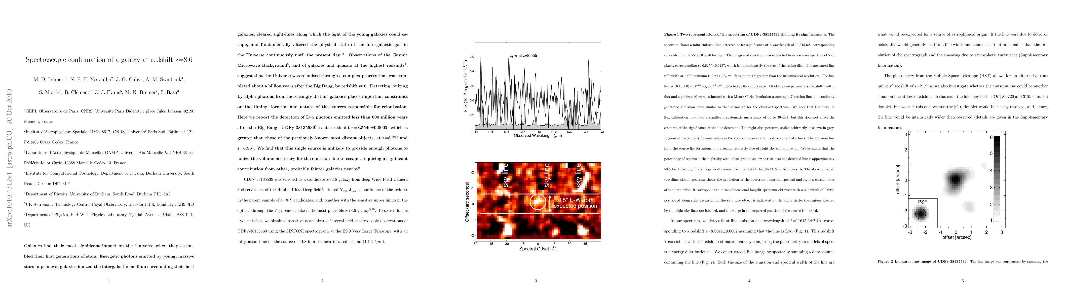 This research confirms the detection of a galaxy, UDFy-38135539, at a redshift of z=8.5549, making it the most distant galaxy observed so far. The galaxy's light was emitted less than 600 million years after the Big Bang, offering insights into the early Universe's reionization process. It suggests that multiple, possibly fainter galaxies contributed to the reionization, rather than just this single, distant source.