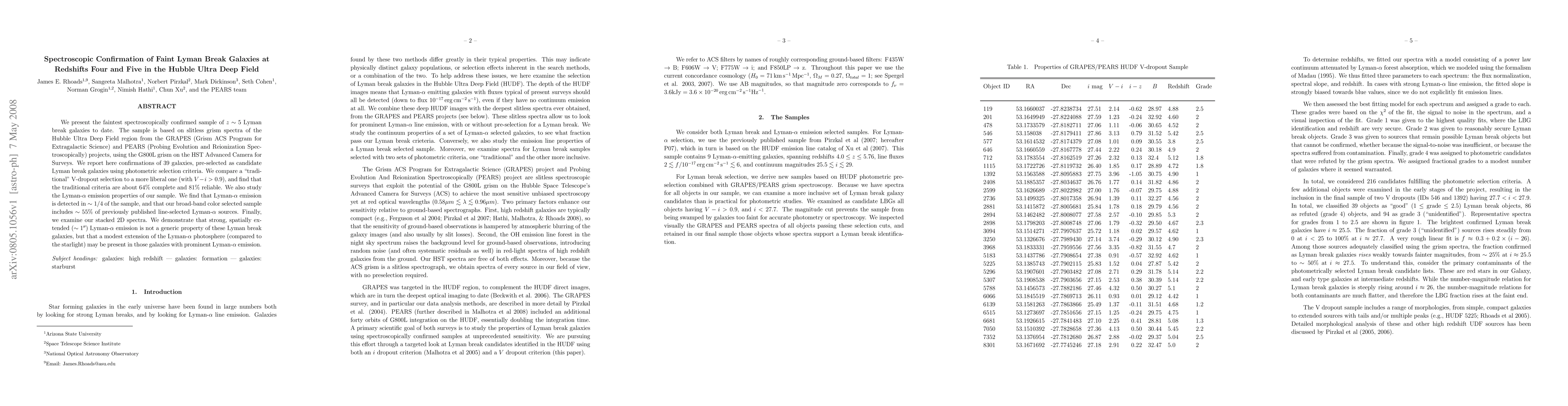 This paper presents spectroscopic confirmation of 39 faint Lyman break galaxies at redshifts four and five in the Hubble Ultra Deep Field, using grism spectra from the GRAPES and PEARS projects. The study finds that traditional photometric selection criteria are 64% complete and 81% reliable, while Lyman alpha emission is detected in about 25% of the galaxies.