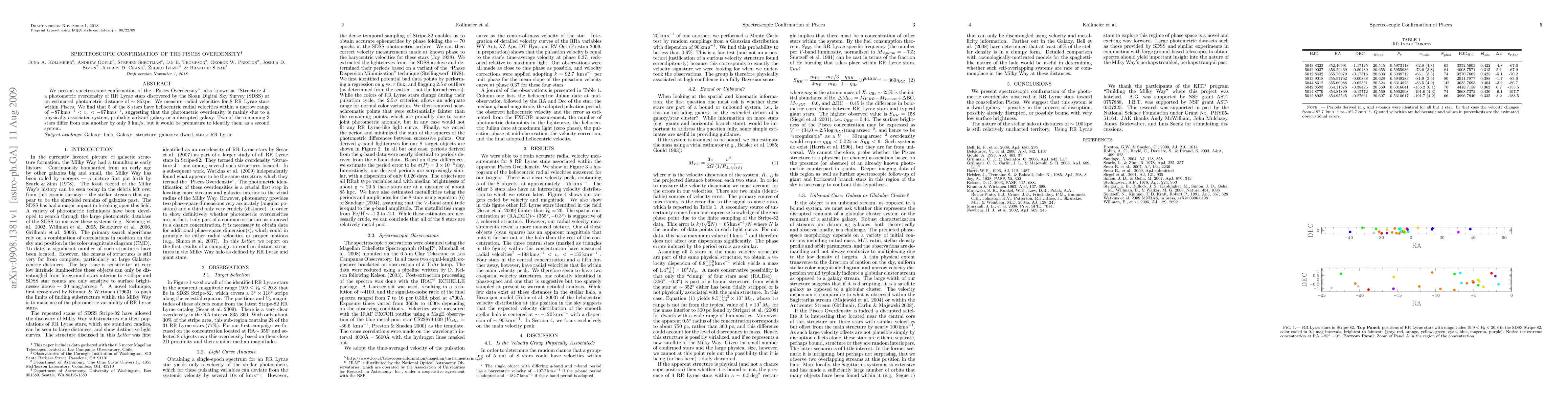 We present spectroscopic confirmation of the "Pisces Overdensity", also known as "Structure J", a photometric overdensity of RR Lyrae stars discovered by the Sloan Digital Sky Survey (SDSS) at an estimated photometric distance of ~85kpc. We measure radial velocities for 8 RR Lyrae stars within Pisces. We find that 5 of the 8 stars have heliocentric radial velocities within a narrow range of -87 km/s < v < -67 km/s, suggesting that the photometric overdensity is mainly due to a physically associated system, probably a dwarf galaxy or a disrupted galaxy. Two of the remaining 3 stars differ from one another by only 9 km/s, but it would be premature to identify them as a second system.