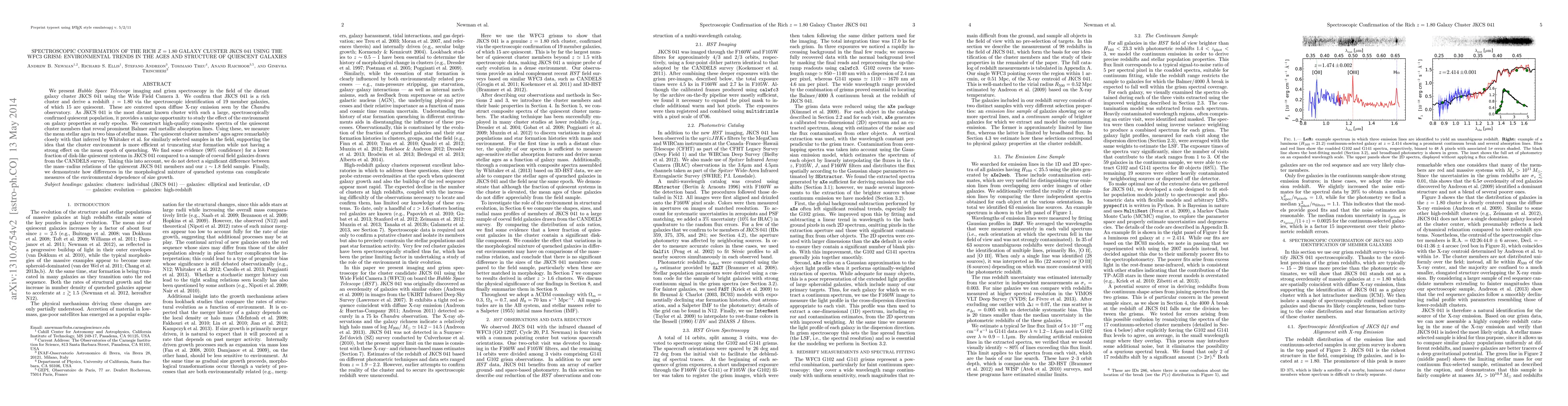 We present Hubble Space Telescope imaging and grism spectroscopy in the field of the distant galaxy cluster JKCS 041 using the Wide Field Camera 3. We confirm that JKCS 041 is a rich cluster and derive a redshift z=1.80 via the spectroscopic identification of 19 member galaxies, of which 15 are quiescent. These are centered upon diffuse X-ray emission seen by the Chandra observatory. As JKCS 041 is the most distant known cluster with such a large, spectroscopically confirmed quiescent population, it provides a unique opportunity to study the effect of the environment on galaxy properties at early epochs. We construct high-quality composite spectra of the quiescent cluster members that reveal prominent Balmer and metallic absorption lines. Using these, we measure the mean stellar ages in two bins of stellar mass. The quiescent cluster members' ages agree remarkably closely with that inferred by Whitaker et al. for similarly selected samples in the field, supporting the idea that the cluster environment is more efficient at truncating star formation while not having a strong effect on the mean epoch of quenching. We find some evidence (90% confidence) for a lower fraction of disk-like quiescent systems in JKCS 041 compared to a sample of coeval field galaxies drawn from the CANDELS survey. Taking this into account, we do not detect a significant difference between the mass-radius relations of the quiescent JKCS 041 members and our z~1.8 field sample. Finally, we demonstrate how differences in the morphological mixture of quenched systems can complicate measures of the environmental dependence of size growth.