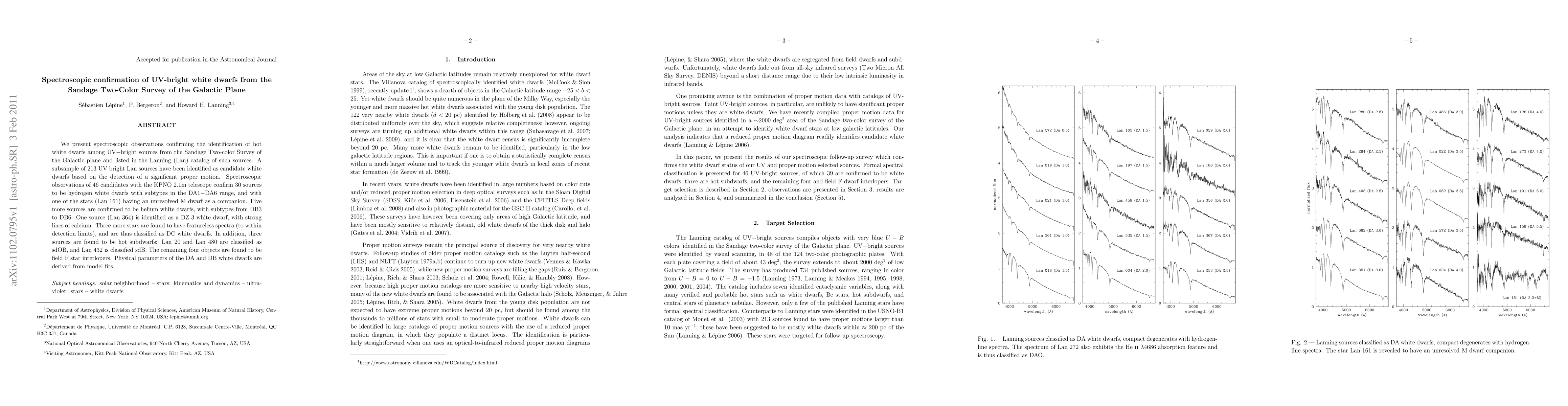 We present spectroscopic observations confirming the identification of hot white dwarfs among UV-bright sources from the Sandage Two-color Survey of the Galactic plane and listed in the Lanning (Lan) catalog of such sources. A subsample of 213 UV bright Lan sources have been identified as candidate white dwarfs based on the detection of a significant proper motion. Spectroscopic observations of 46 candidates with the KPNO 2.1m telescope confirm 30 sources to be hydrogen white dwarfs with subtypes in the DA1-DA6 range, and with one of the stars (Lan 161) having an unresolved M dwarf as a companion. Five more sources are confirmed to be helium white dwarfs, with subtypes from DB3 to DB6. One source (Lan 364) is identified as a DZ 3 white dwarf, with strong lines of calcium. Three more stars are found to have featureless spectra (to within detection limits), and are thus classified as DC white dwarfs. In addition, three sources are found to be hot subdwarfs: Lan 20 and Lan 480 are classified as sdOB, and Lan 432 is classified sdB. The remaining four objects are found to be field F star interlopers. Physical parameters of the DA and DB white dwarfs are derived from model fits.