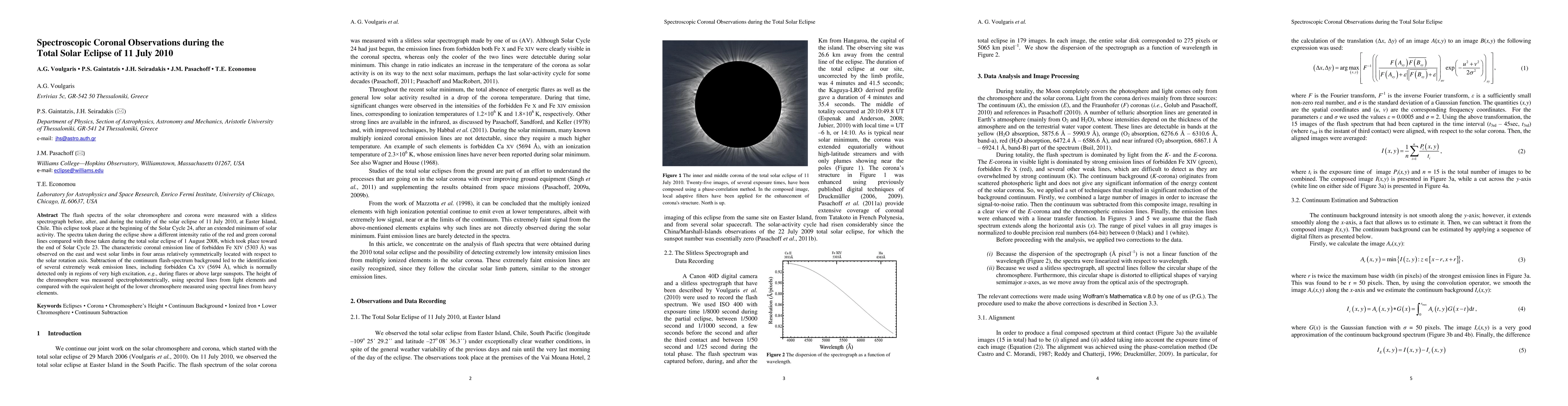 The flash spectrum of the solar chromosphere and corona was measured with a slitless spectrograph before, after, and during the totality of the solar eclipse, of 11 July 2010, at Easter Island, Chile. This eclipse took place at the beginning of the Solar Cycle 24, after an extended minimum of solar activity. The spectra taken during the eclipse show a different intensity ratio of the red and green coronal lines compared with those taken during the total solar eclipse of 1 August 2008, which took place towards the end of the Solar Cycle 23. The characteristic coronal forbidden emission line of forbidden Fe XIV (5303 {\AA}) was observed on the east and west solar limbs in four areas relatively symmetrically located with respect to the solar rotation axis. Subtraction of the continuum flash-spectrum background led to the identification of several extremely weak emission lines, including forbidden Ca XV (5694 {\AA}), which is normally detected only in regions of very high excitation, e.g., during flares or above large sunspots. The height of the chromosphere was measured spectrophotometrically, using spectral lines from light elements and compared with the equivalent height of the lower chromosphere measured using spectral lines from heavy elements.