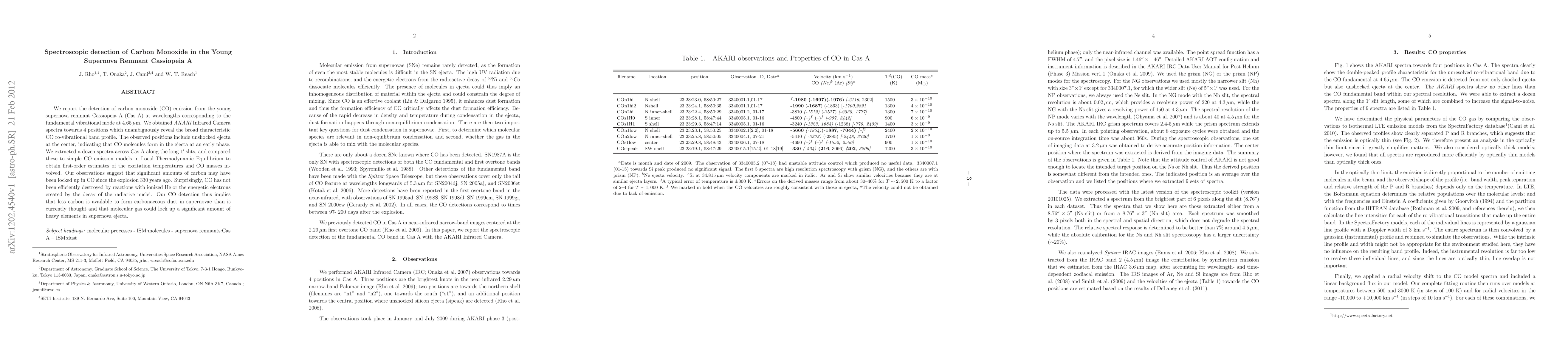 This paper reports the spectroscopic detection of carbon monoxide (CO) in the young supernova remnant Cassiopeia A, revealing CO formation in the ejecta early after the explosion. The findings suggest that CO may sequester significant amounts of carbon, potentially reducing the availability for carbonaceous dust formation.