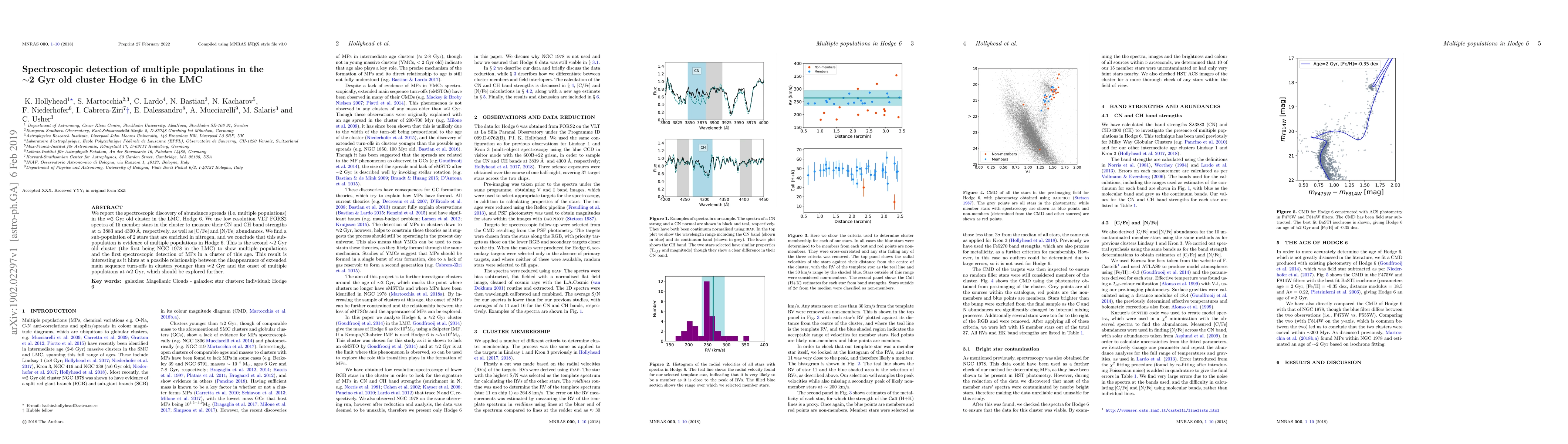The paper reports the spectroscopic detection of multiple populations in the ~2 Gyr old cluster Hodge 6 in the LMC, identifying a sub-population enriched in nitrogen. This finding suggests a possible link between the emergence of multiple populations and the disappearance of extended main sequence turn-offs in clusters younger than ~2 Gyr.