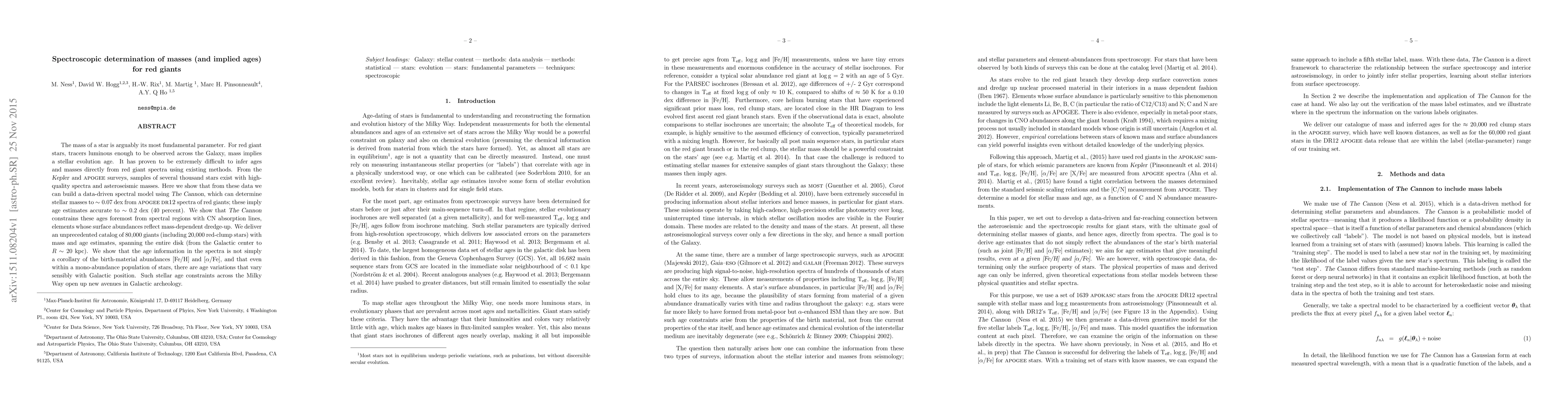 This paper presents a data-driven spectral model using The Cannon to determine masses and ages for red giants from APOGEE DR12 spectra, achieving mass estimates to $\sim$ 0.07 dex and age estimates to $\sim$ 0.2 dex. This method reveals age variations across the Milky Way, independent of birth-material abundances, offering new insights into Galactic archeology.