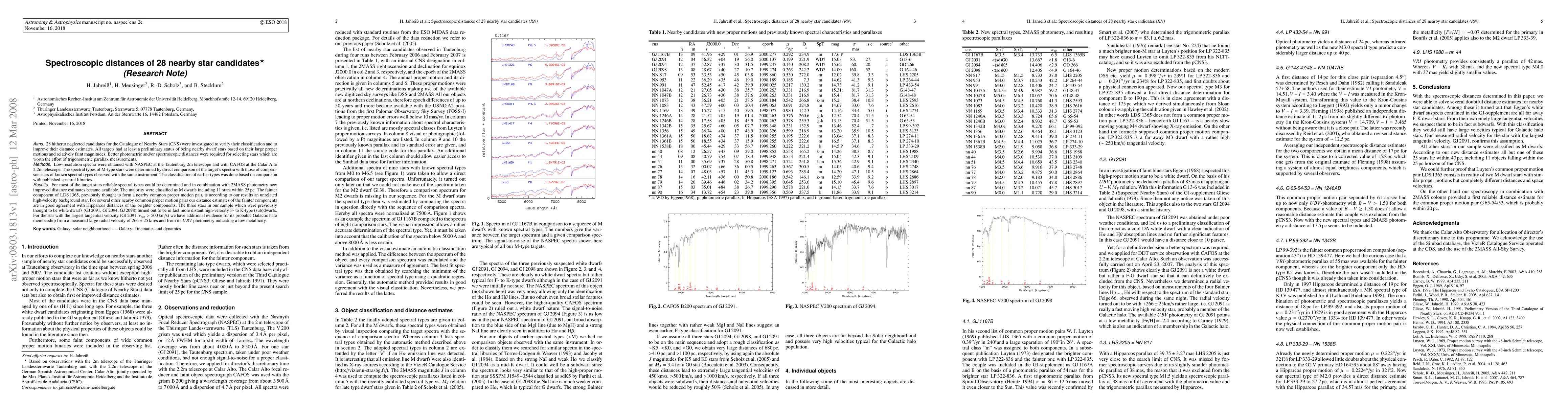28 hitherto neglected candidates for the Catalogue of Nearby Stars (CNS) were investigated to verify their classification and to improve their distance estimates. All targets had at least a preliminary status of being nearby dwarf stars based on their large proper motions and relatively faint magnitudes. Better photometric and/or spectroscopic distances were required for selecting stars which are worth the effort of trigonometric parallax measurements. Low-resolution spectra were obtained with NASPEC at the Tautenburg 2m telescope and with CAFOS at the Calar Alto 2.2m telescope. The spectral types of M-type stars were determined by direct comparison of the target's spectra with those of comparison stars of known spectral types observed with the same instrument. The classification of earlier types was done based on comparison with published spectral libraries. The majority were classified as M dwarfs including 11 stars within 25 pc. The fainter component of LDS 1365, previously thought to form a nearby common proper motion pair, is according to our results an unrelated high-velocity background star. For several other nearby common proper motion pairs our distance estimates of the fainter components are in good agreement with Hipparcos distances of the brighter components. (abridged)