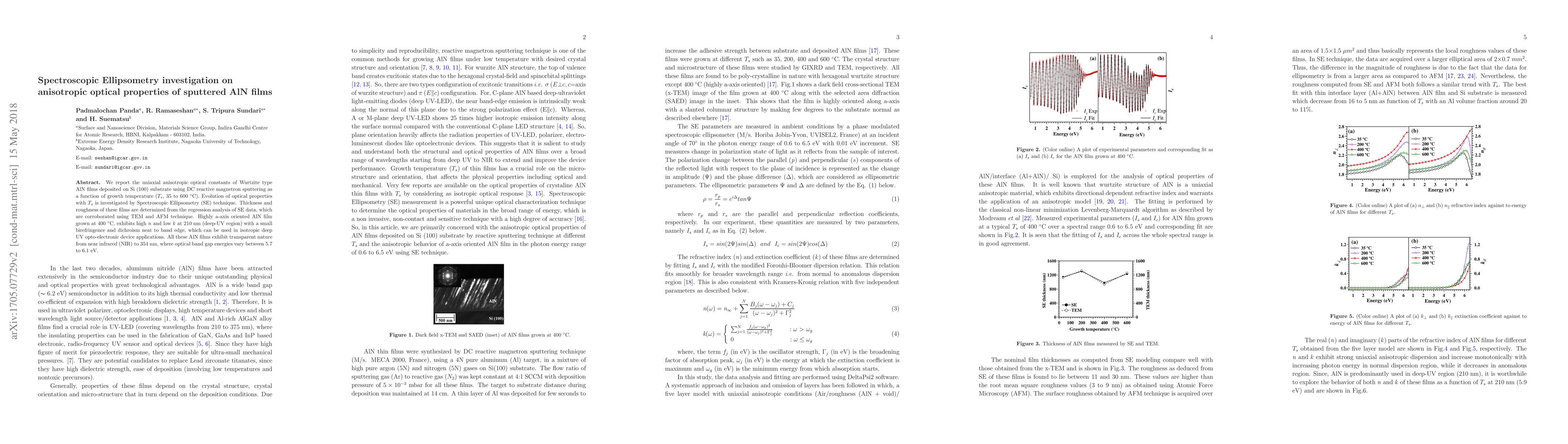 This study uses Spectroscopic Ellipsometry to investigate the anisotropic optical properties of sputtered AlN films deposited on Si substrates at varying temperatures. High-quality, a-axis oriented AlN films grown at 400°C show promising deep-UV optoelectronic properties.