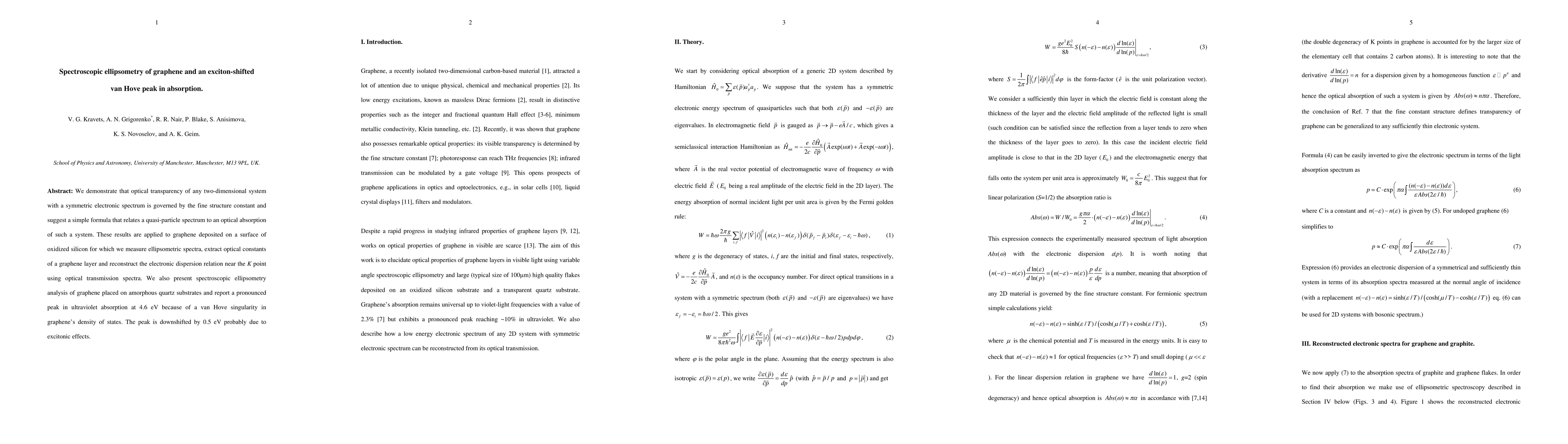 This paper uses spectroscopic ellipsometry to analyze the optical properties of graphene, revealing a downshifted van Hove singularity peak in ultraviolet absorption likely due to excitonic effects. The study also proposes a formula linking quasi-particle spectra to optical absorption in two-dimensional systems.