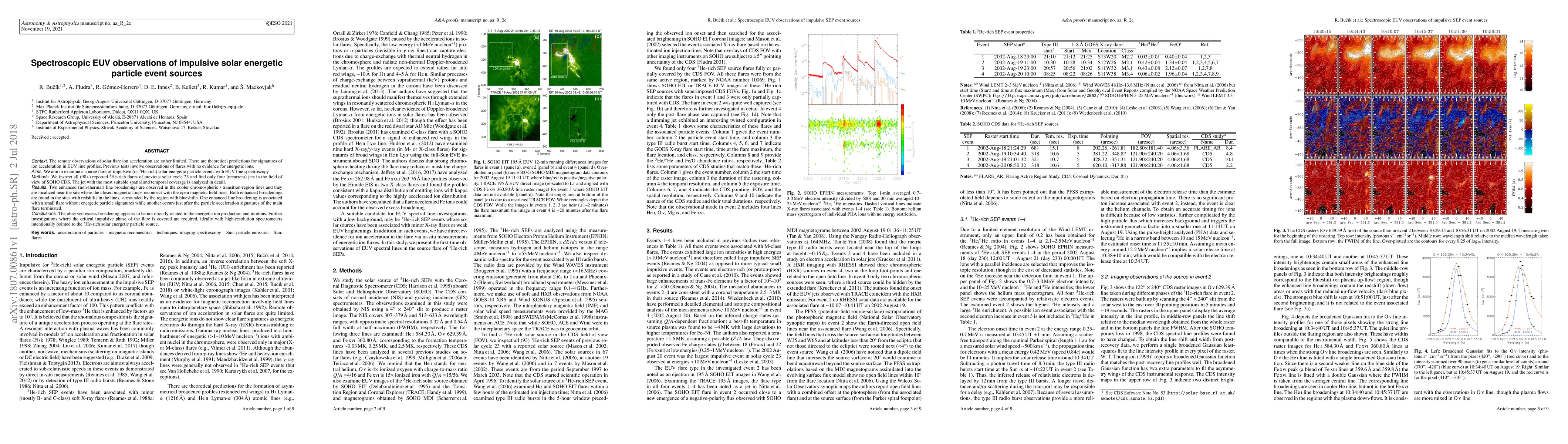 Context. The remote observations of solar flare ion acceleration are rather limited. There are theoretical predictions for signatures of ion acceleration in EUV line profiles. Previous tests involve observations of flares with no evidence for energetic ions. Aims. We aim to examine a source flare of impulsive (or 3He-rich) solar energetic particle events with EUV line spectroscopy. Methods. We inspect all (90+) reported 3He-rich flares of previous solar cycle 23 and find only four (recurrent) jets in the field of view of SOHO CDS. The jet with the most suitable spatial and temporal coverage is analyzed in detail. Results. Two enhanced (non-thermal) line broadenings are observed in the cooler chromospheric / transition-region lines and they are localized near the site where the closed magnetic loops reconnect with the open magnetic field lines. Both enhanced broadenings are found in the sites with redshifts in the lines, surrounded by the region with blueshifts. One enhanced line broadening is associated with a small flare without energetic particle signatures while another occurs just after the particle acceleration signatures of the main flare terminated. Conclusions. The observed excess broadening appears to be not directly related to the energetic ion production and motions. Further investigations where the critical impulsive phase of the flare is covered are required, ideally with high-resolution spectrometers intentionally pointed to the 3He-rich solar energetic particle source.