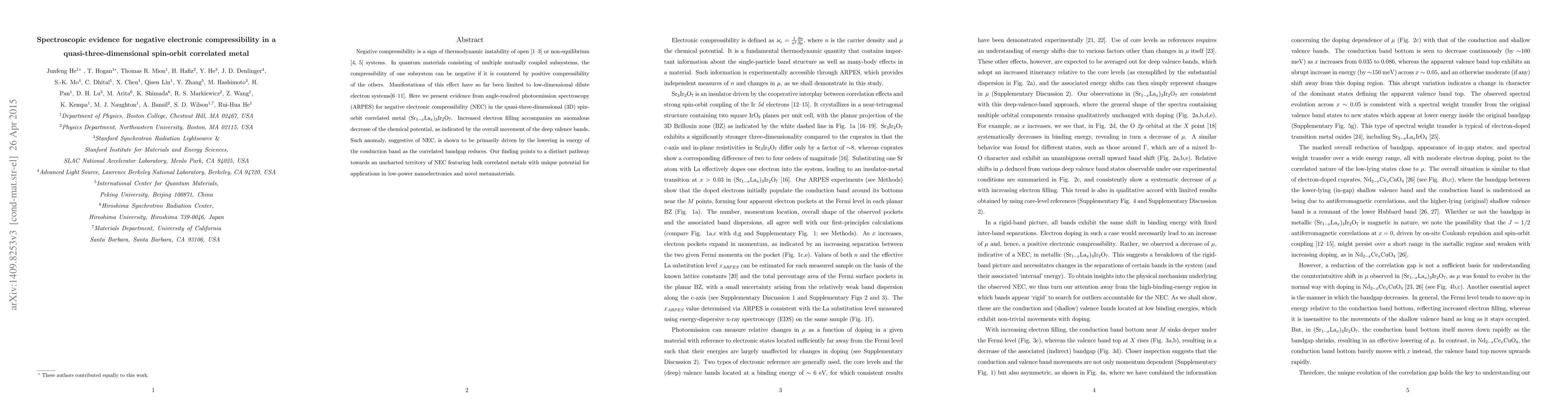 This paper presents spectroscopic evidence from ARPES for negative electronic compressibility in the quasi-three-dimensional metal (Sr1-xLax)3Ir2O7, indicating a unique thermodynamic instability driven by the reduction of the correlated bandgap. This discovery suggests potential applications in low-power nanoelectronics and novel metamaterials.