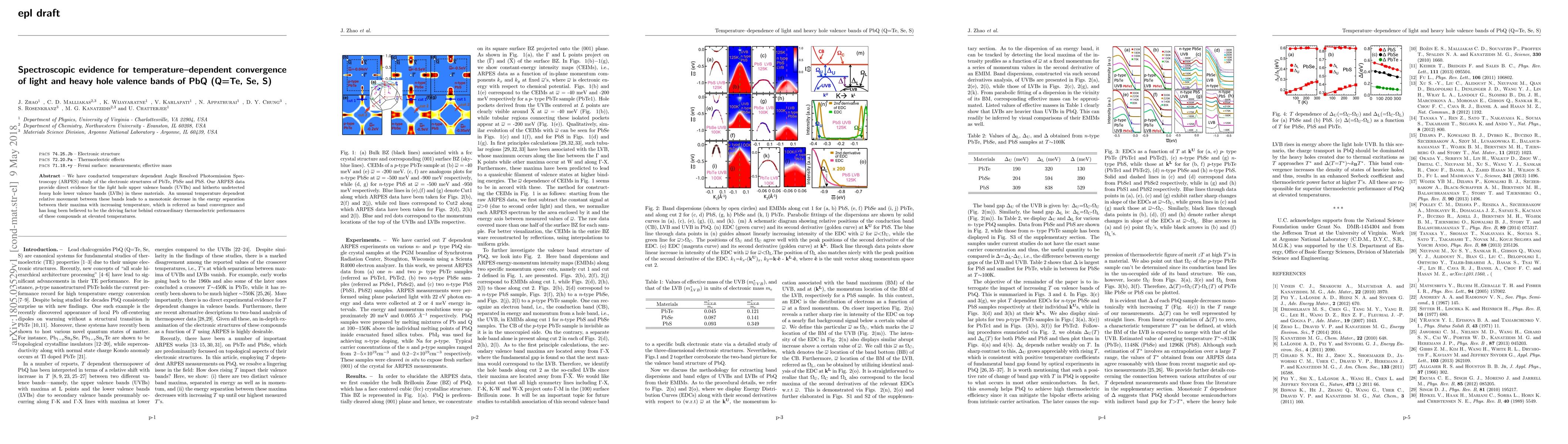 This paper reports on a temperature-dependent ARPES study revealing the convergence of light and heavy hole valence bands in PbTe, PbSe, and PbS, indicating a decreasing energy separation with rising temperature, which is hypothesized to enhance thermoelectric performance.