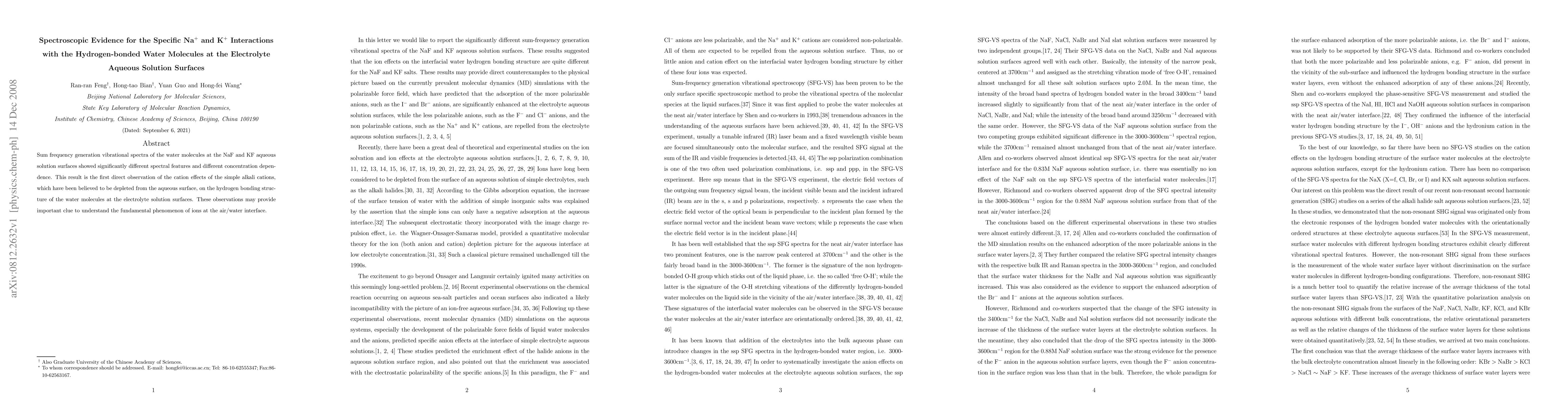 This study reveals distinct spectral features in sum frequency generation vibrational spectra of water molecules at NaF and KF solution surfaces, indicating specific Na+ and K+ interactions with hydrogen-bonded water. This provides direct evidence of cation effects on water's hydrogen bonding structure at electrolyte surfaces, challenging previous beliefs.