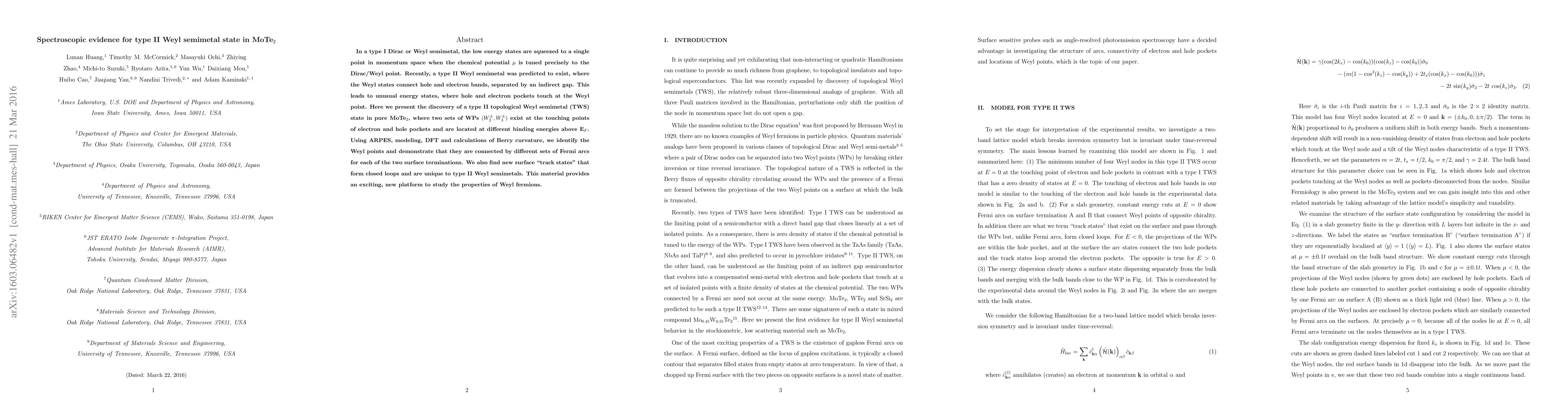 This research identifies the presence of a type II Weyl semimetal state in pure MoTe2 using ARPES, modeling, and DFT. It reveals two Weyl points connected by different Fermi arcs and new "track states," demonstrating unique topological properties.