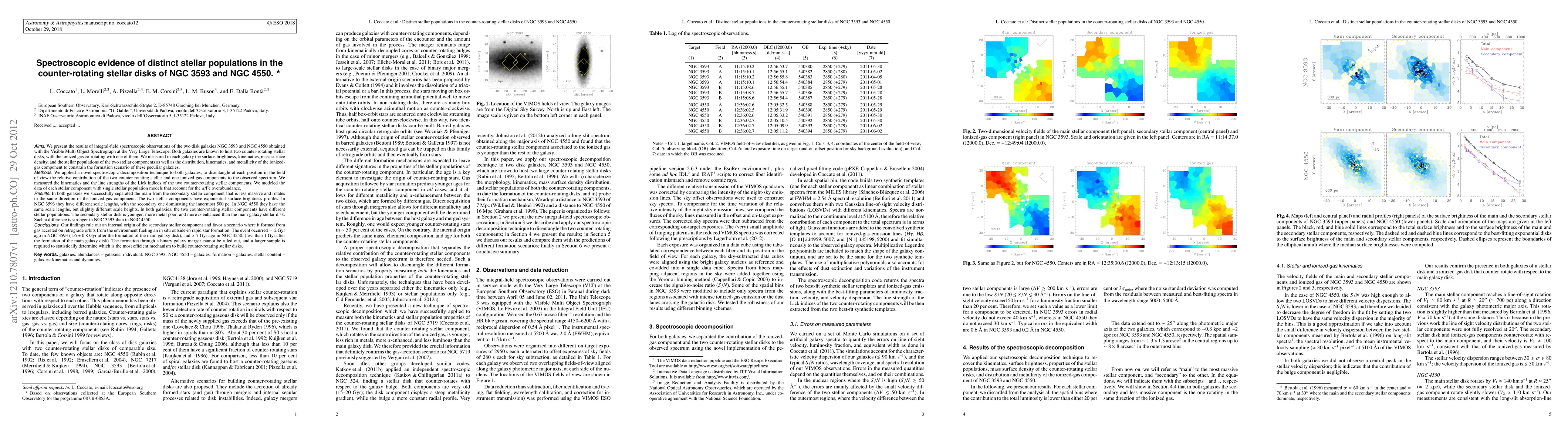 We present the results of integral-field spectroscopic observations of the two disk galaxies NGC 3593 and NGC 4550 obtained with VIMOS/VLT. Both galaxies are known to host 2 counter-rotating stellar disks, with the ionized gas co-rotating with one of them. We measured in each galaxy the ionized gas kinematics and metallicity, and the surface brightness, kinematics, mass surface density, and the stellar populations of the 2 stellar components to constrain the formation scenario of these peculiar galaxies. We applied a novel spectroscopic decomposition technique to both galaxies, to separate the relative contribution of the 2 counter-rotating stellar and one ionized-gas components to the observed spectrum. We measured the kinematics and the line strengths of the Lick indices of the 2 counter-rotating stellar components. We modeled the data of each stellar component with single stellar population models that account for the alpha/Fe overabundance. In both galaxies we successfully separated the main from the secondary stellar component that is less massive and rotates in the same direction of the ionized-gas component. The 2 stellar components have exponential surface-brightness profiles. In both galaxies, the two counter-rotating stellar components have different stellar populations: the secondary stellar disk is younger, more metal poor, and more alpha-enhanced than the main galaxy stellar disk. Our findings rule out an internal origin of the secondary stellar component and favor a scenario where it formed from gas accreted on retrograde orbits from the environment fueling an in situ outside-in rapid star formation. The event occurred ~ 2 Gyr ago in NGC 3593, and ~ 7 Gyr ago in NGC 4550. The binary galaxy merger scenario cannot be ruled out, and a larger sample is required to statistically determine which is the most efficient mechanism to build counter-rotating stellar disks (abridged).