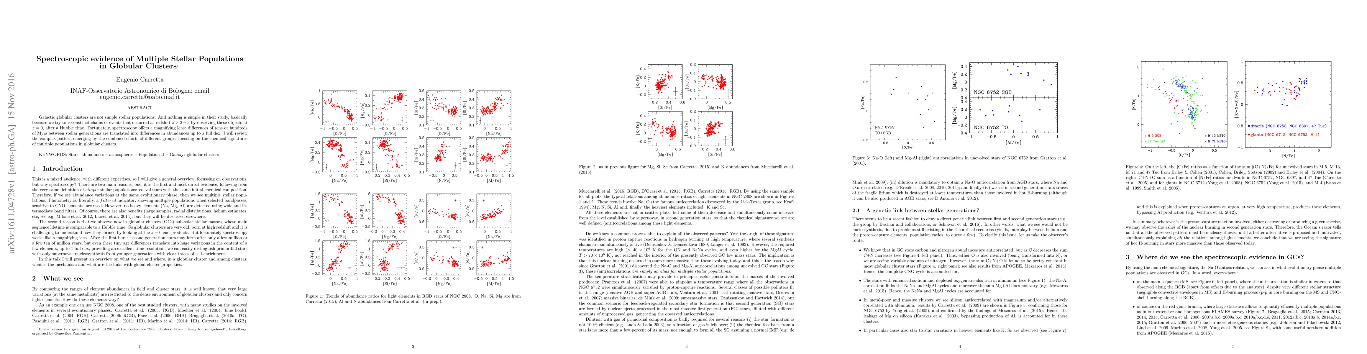 This paper reviews spectroscopic evidence revealing the existence of multiple stellar populations in globular clusters, highlighting the complex chemical signatures that differentiate these populations and the challenges in reconstructing their formation histories.