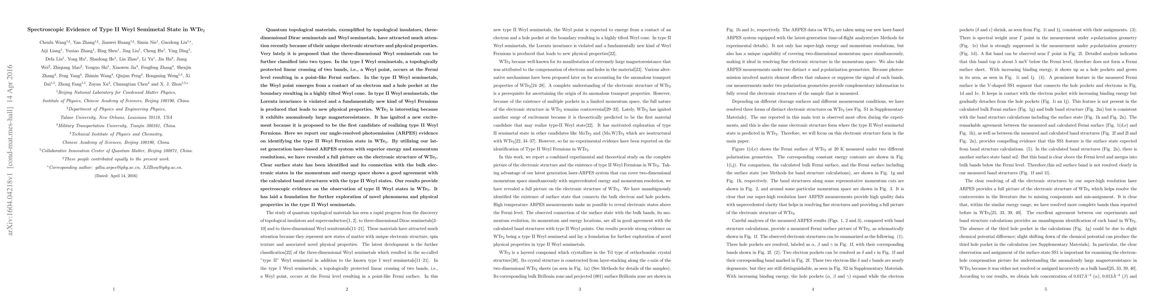 This research paper reports spectroscopic evidence using angle-resolved photoemission spectroscopy (ARPES) to identify a type II Weyl semimetal state in WTe2. The study reveals a highly tilted Weyl cone and confirms the presence of type II Weyl Fermions, establishing a foundation for exploring new physical properties in this novel material.