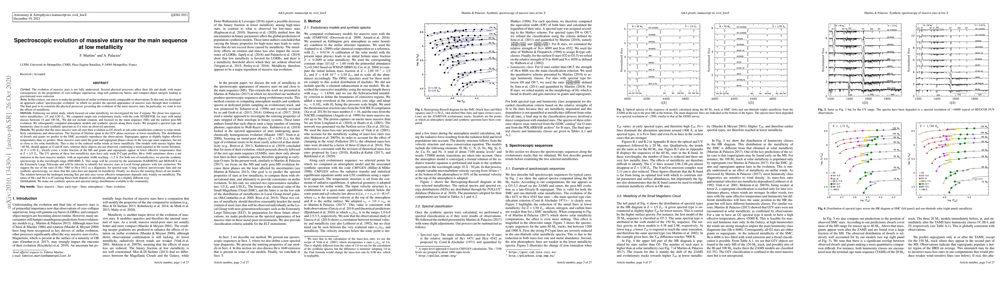 This paper presents synthetic spectra and SEDs for massive stars evolving at low metallicity, showing that lower metallicity increases the fraction of time spent in the O2V phase. The models predict a wider distribution of dwarfs and lower effective temperatures for giants and supergiants at the lowest metallicity, with implications for identifying hot massive stars in low-extinction galaxies.
