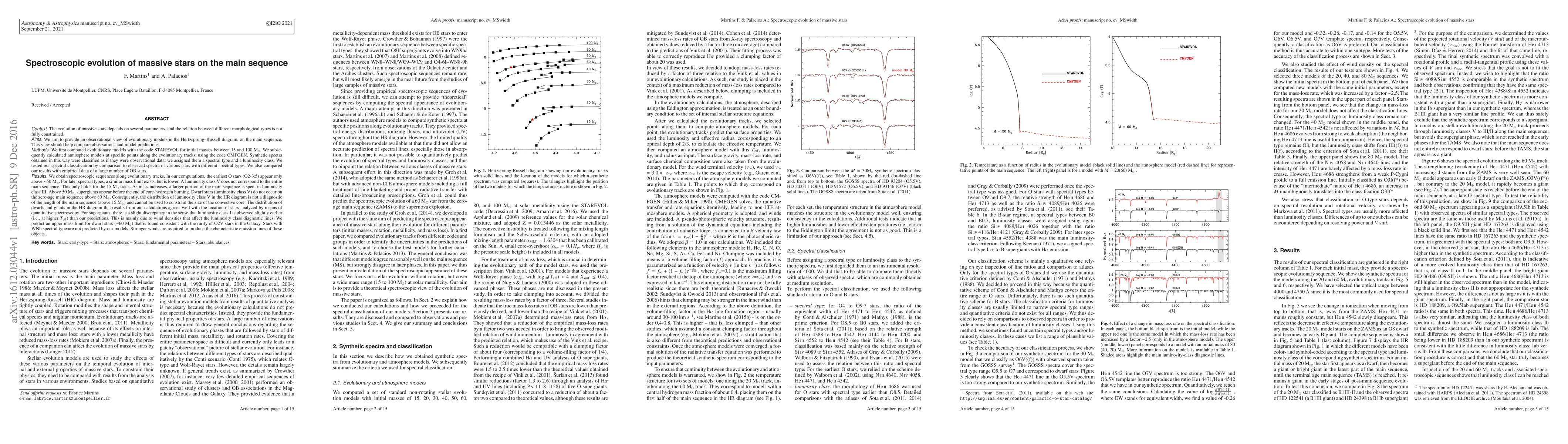 This study uses STAREVOL and CMFGEN codes to model the evolution of massive stars on the main sequence, generating synthetic spectra that are compared to observed data. The findings suggest that the earliest O stars appear above 50 Msun, and luminosity class V only applies to the 15 Msun track, with larger masses spending more time in luminosity class III.