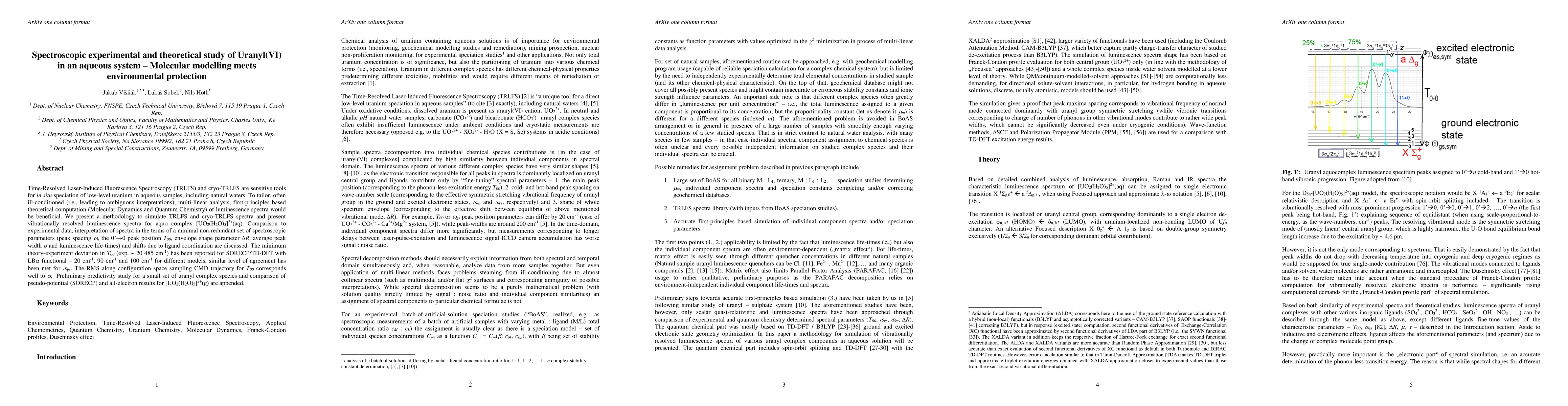 Time-Resolved Laser-Induced Fluorescence Spectroscopy (TRLFS) and cryo-TRLFS are sensitive tools for \textit{in situ} speciation of low-level uranium in aqueous samples, including natural waters. To tailor, often ill-conditioned (i.e., leading to ambiguous interpretations), multi-linear analysis, first-principles based theoretical computation (Molecular Dynamics and Quantum Chemistry) of luminescence spectra would be beneficial. We present a methodology to simulate TRLFS and cryo-TRLFS spectra and present vibrationally resolved luminescence spectra for aquo complex [UO$_2$(H$_2$O)$_5$]$^{2+}$(aq). Comparison to experimental data, interpretation of spectra in the terms of a minimal non-redundant set of spectroscopic parameters (peak spacing \omega, the 0' $\rightarrow$ 0 peak position T$_{00}$, envelope shape parameter \Delta R, average peak width \sigma and luminescence life-times) and shifts due to ligand coordination are discussed. The minimum theory-experiment deviation in T$_{00}$ (exp. $\sim$ 20 485 cm$^{-1}$) has been reported for SORECP/TD-DFT with LB$\alpha$ functional - 20 cm$^{-1}$, 90 cm$^{-1}$ and 100 cm$^{-1}$ for different models, a similar level of agreement has been met for \omega$_{gs}$. The RMS along configuration space sampling CMD trajectory for T$_{00}$ corresponds well to \sigma. Preliminary predictivity study for a small set of uranyl complex species and comparison of pseudo-potential (SORECP) and all-electron results for [UO$_2$(H$_2$O)$_5$]$^{2+}$(g) are appended.