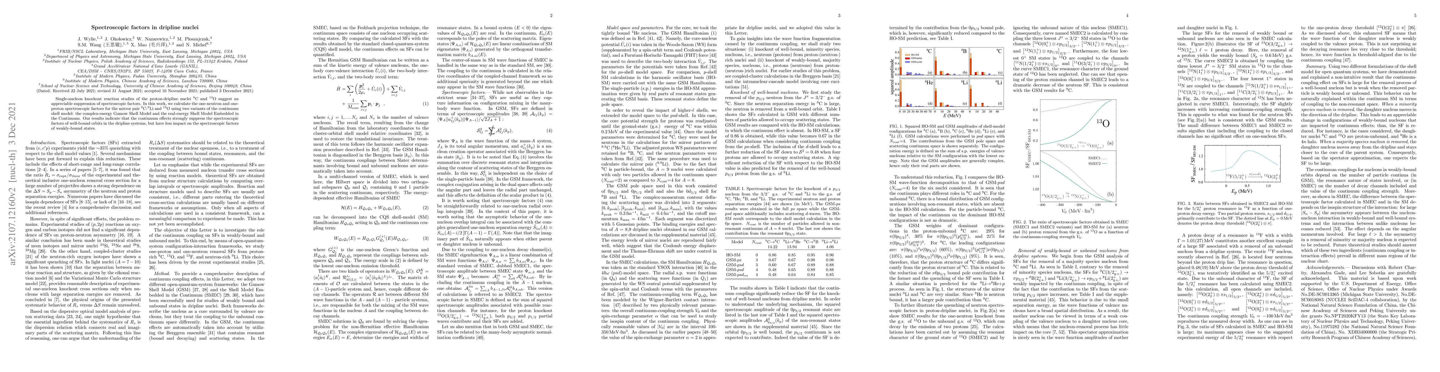 Single-nucleon knockout reaction studies of the proton-dripline nuclei $^9$C and $^{13}$O suggest an appreciable suppression of spectroscopic factors. In this work, we calculate the one-neutron and one-proton spectroscopic factors for the mirror pair $^9$C-$^9$Li and $^{13}$O using two variants of the continuum shell model: the complex-energy Gamow Shell Model and the real-energy Shell Model Embedded in the Continuum. Our results indicate that the continuum effects strongly suppress the spectroscopic factors of well-bound orbits in the dripline systems, but have less impact on the spectroscopic factors of weakly-bound states.