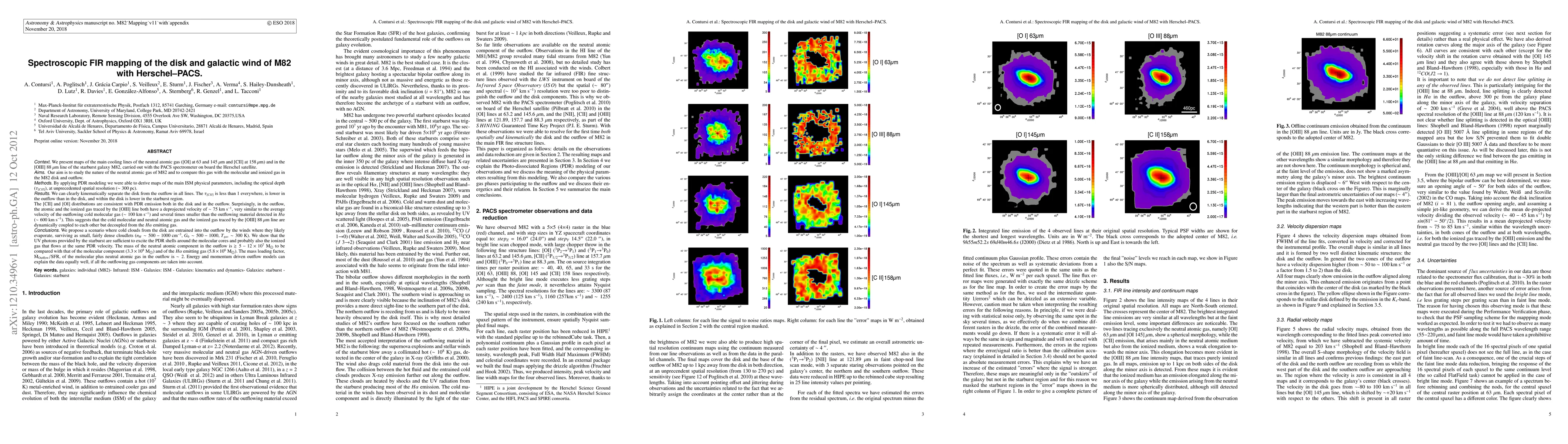 This study uses Herschel-PACS to map cooling lines in M82, revealing the disk and galactic wind's physical parameters. The neutral atomic and ionized gas in the outflow share similar velocities, suggesting dynamic coupling, while differing from Halpha-emitting gas, indicating decoupling.